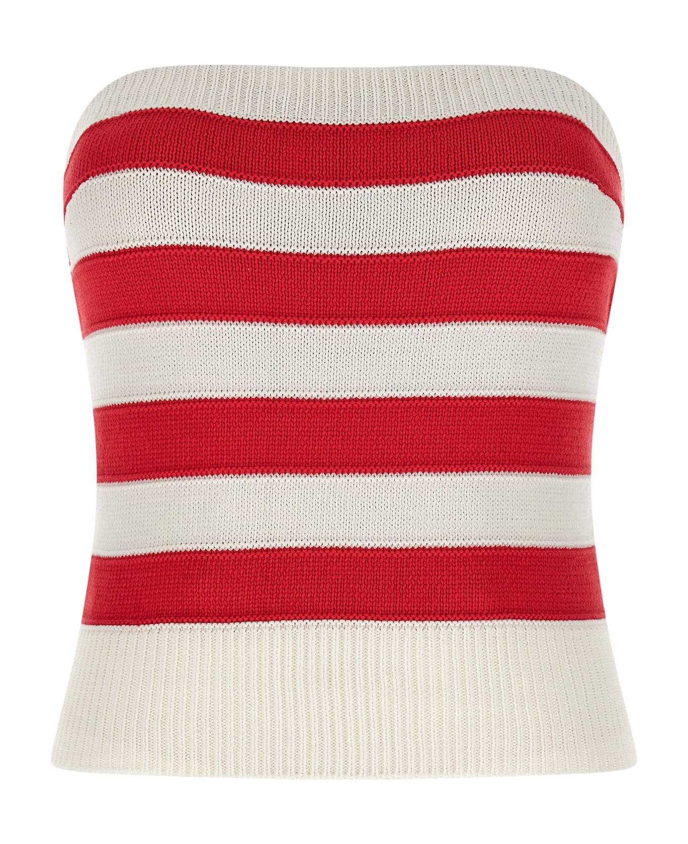 Crochet cotton blend top, off-the-shoulder crop bustier model with preformed cues and cups, sleeveless, back zip closure.