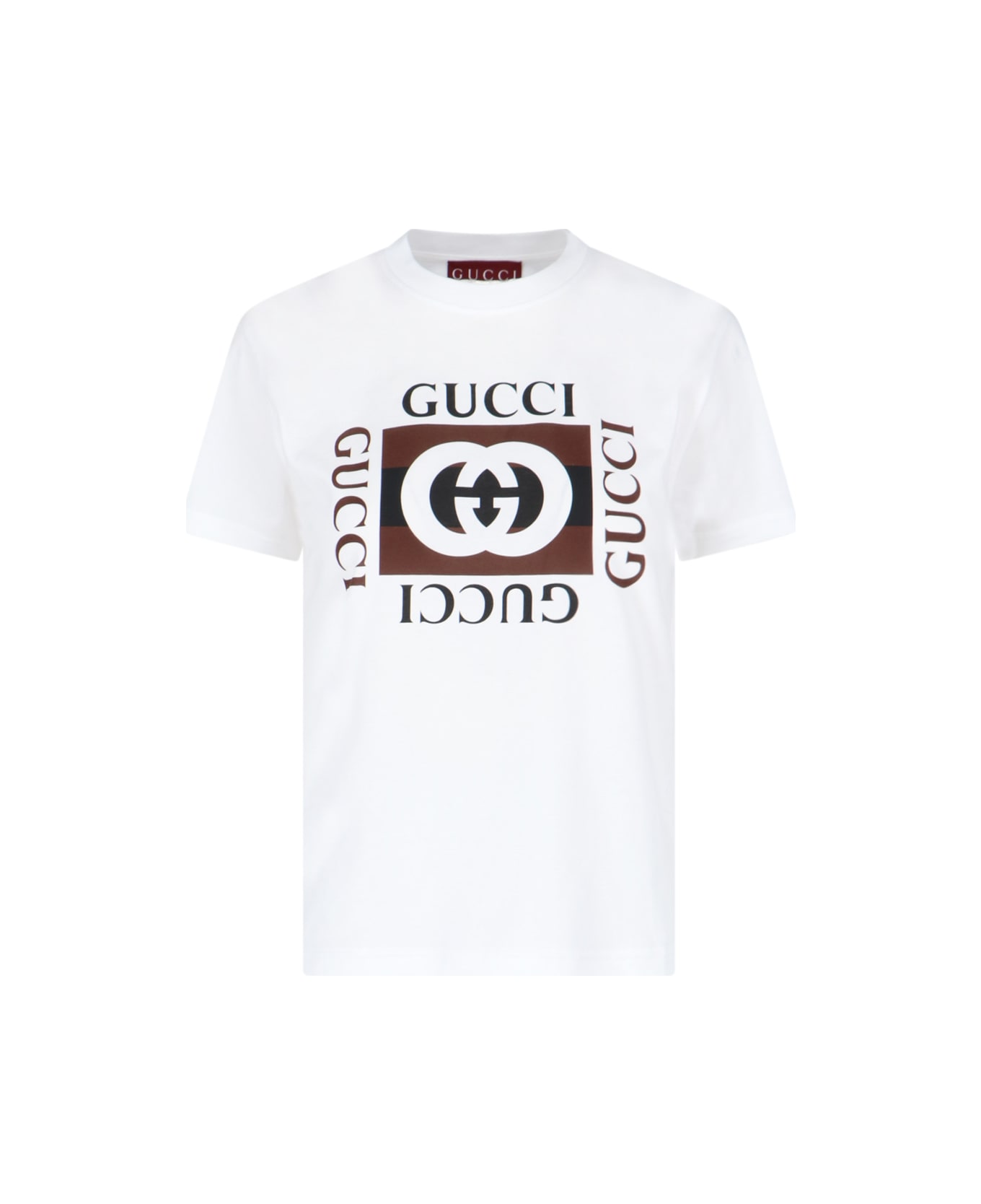 Gucci printed t-shirt in white cotton jersey with brown and contrast details, crew neck, short sleeves, front logo print, ribbed trims, straight hem. Composition: 100% Cotton
