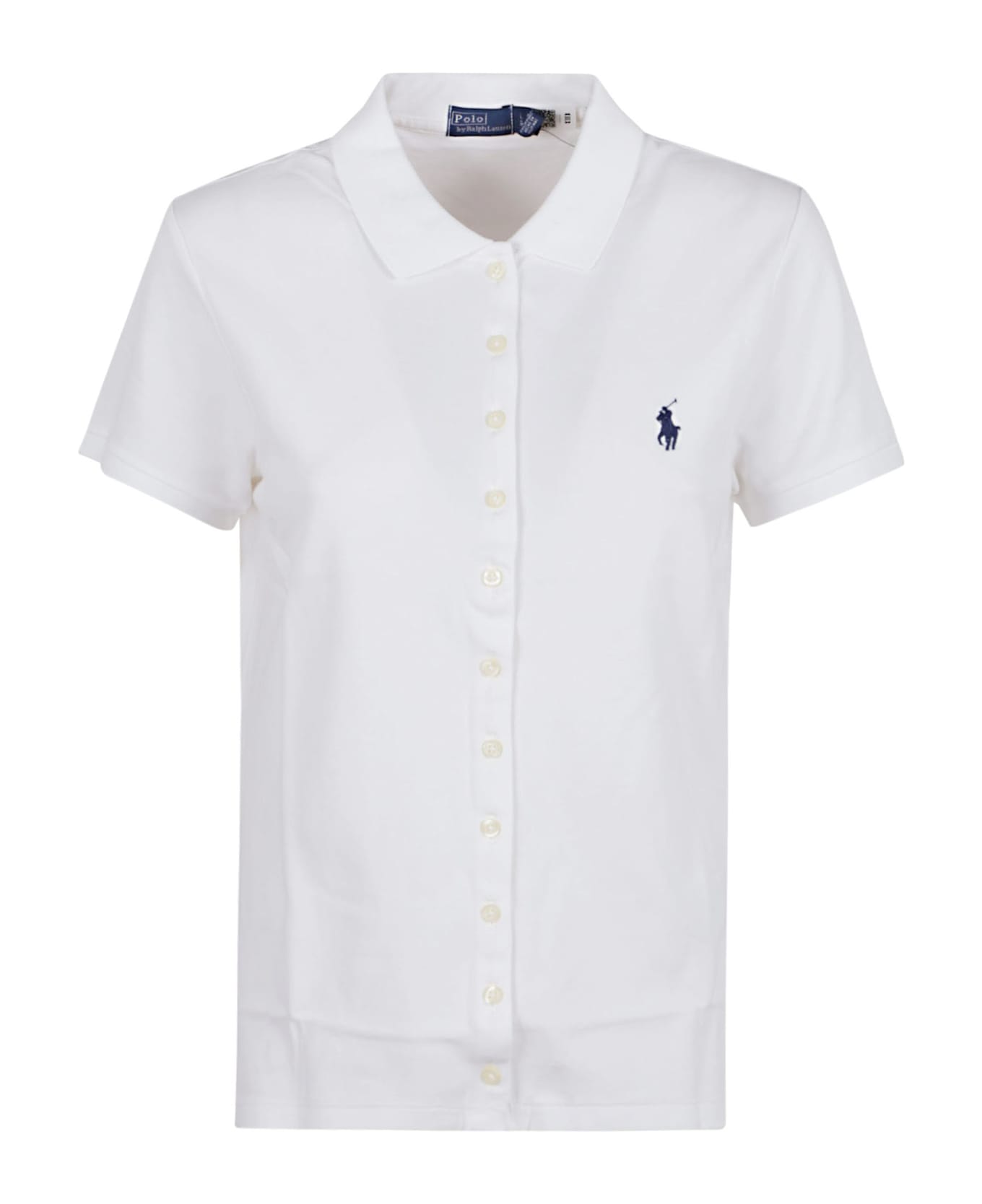 white stretch cotton polo with buttons down to the bottom and classic pony collar polo rl embroidered on the left side in blue