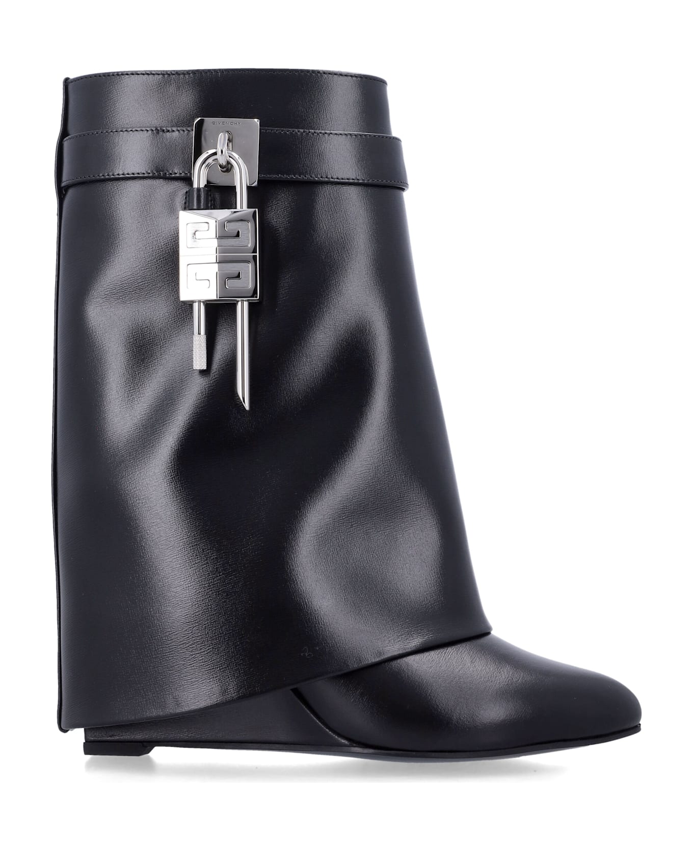 A Signature Statement From The Shark Lock Line, These Givenchy Ankle Boots Are Crafted In Smooth Calfskin Leather With A Sleek, Sculptural Silhouette. The Asymmetrical Padlocks silver 4g On One Side, Mixed-metal Givenchy On The Other add A Refined Yet Edgy Finish. Complete With Concealed Wedge Heels And Subtle Branding, They Embody Modern Luxury. Smooth Calfskin Leather Upper