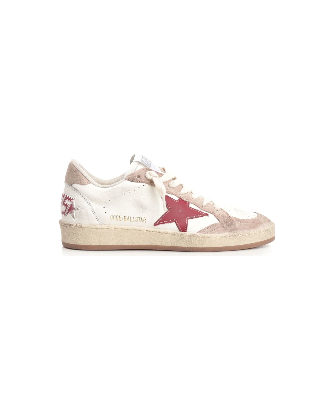 'Ball Star' sneakers from Golden Goose with a worn effect, made of off-white leather and finished with pink suede inserts, raspberry red star and heel, side gold lettering.