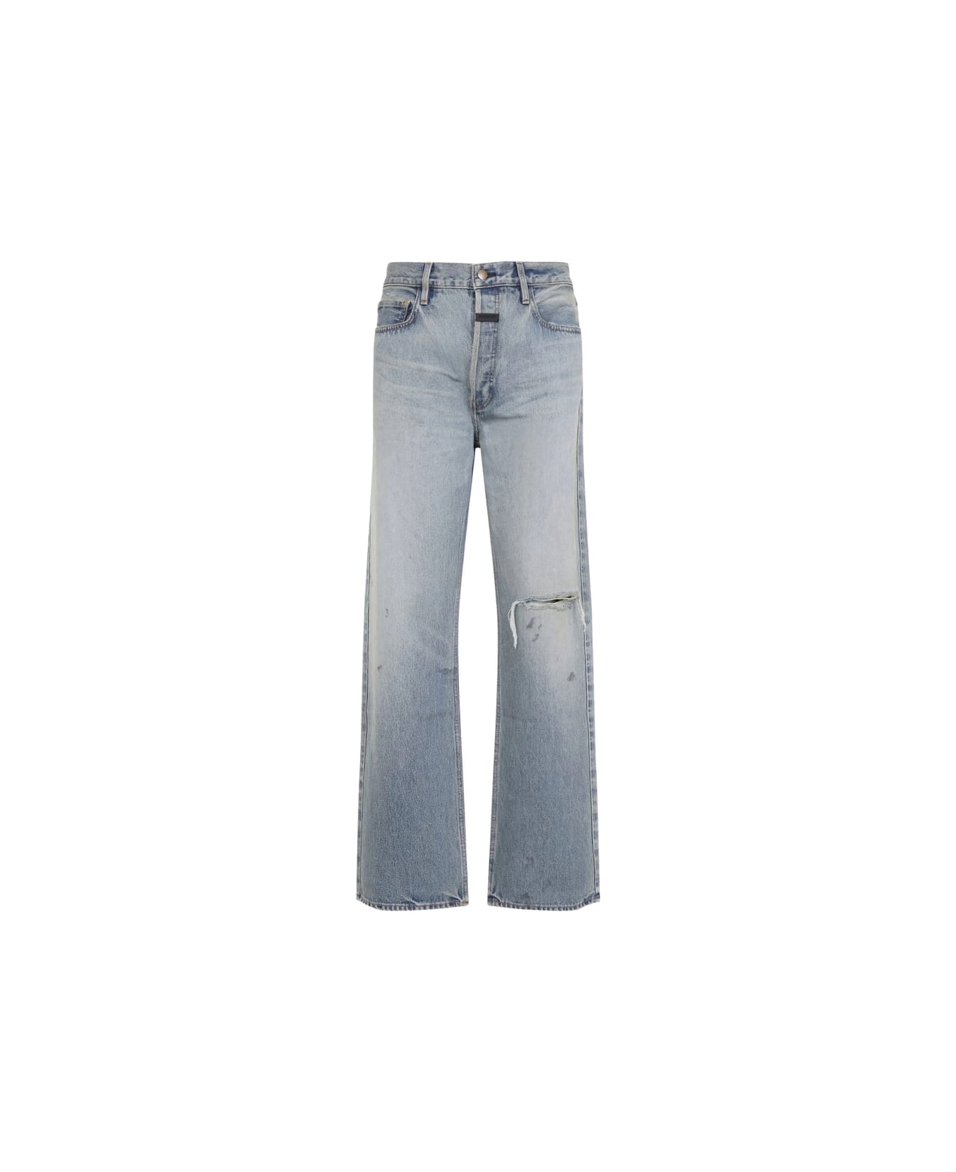 blue distressed detailing faded wash knee rips button fly five-pocket styling