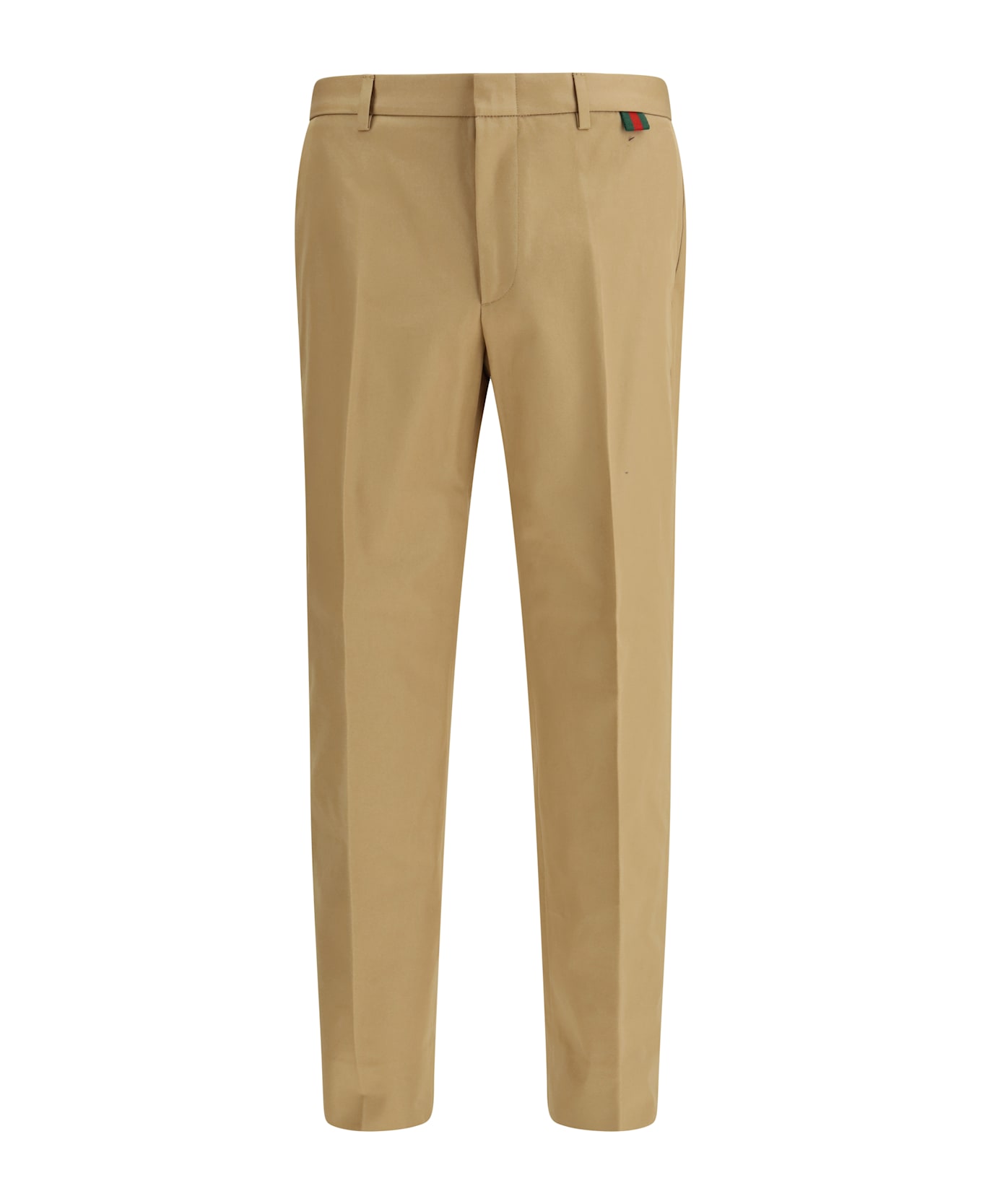 The cotton trousers by gucci elevate a classic silhouette through the house s unmistakable web detail placed along the waistband. crafted from pure cotton, they balance structure and ease, while central pressed pleats refine the shape. belt loops, a concealed zip-and-hook closure, and both side and rear welt pockets complete this polished, understated essential.