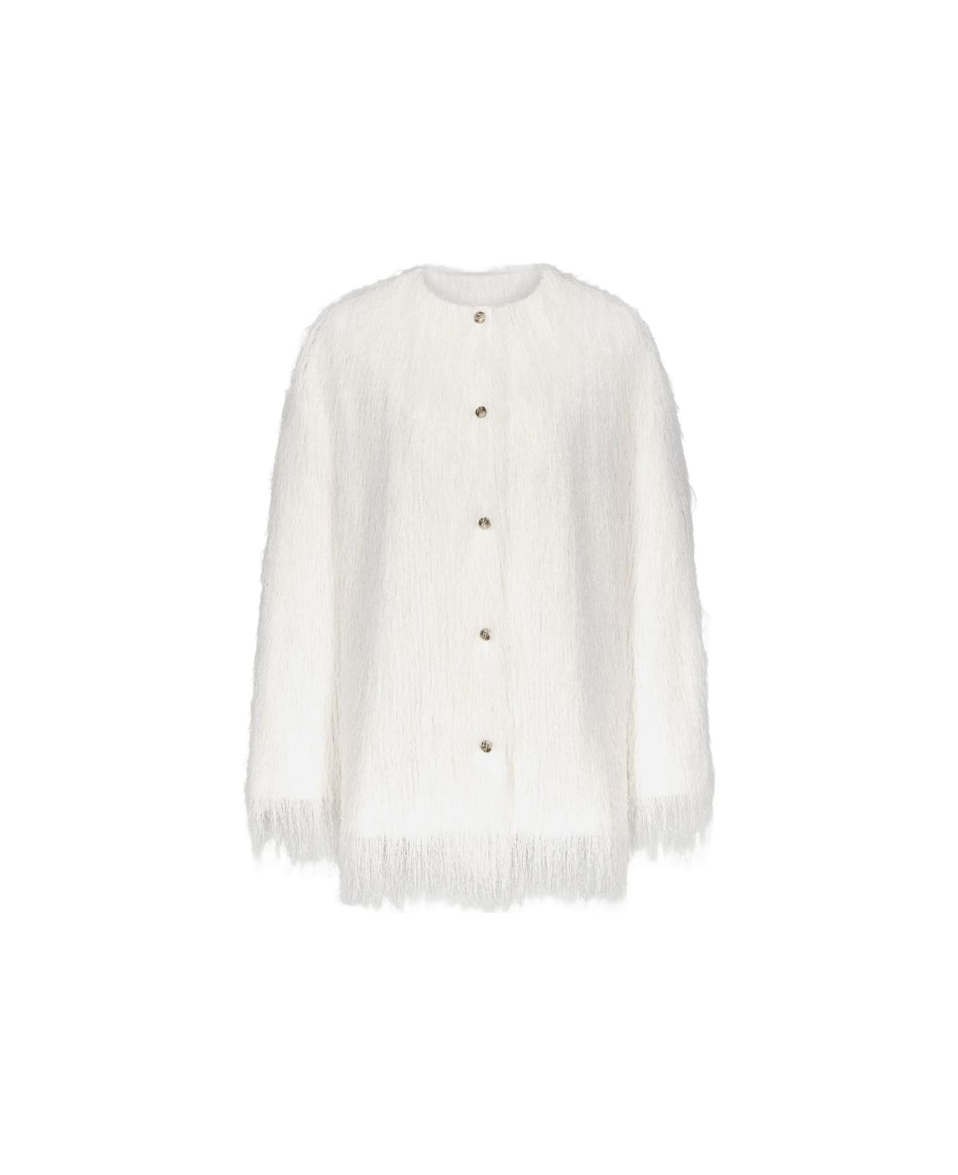 white fringed fabric button fastening collarless neckline rounded lines five buttons