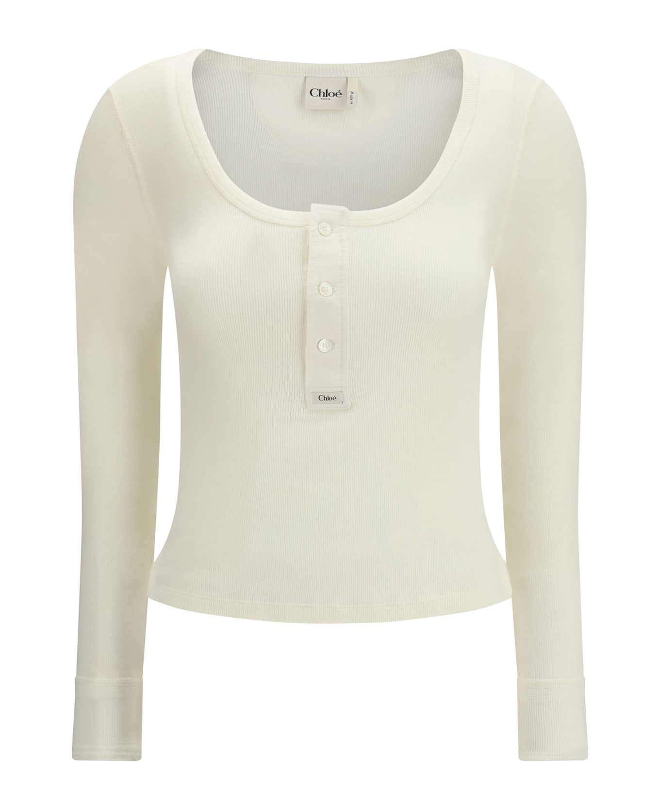 The cotton jersey henley t-shirt by chloé features a fitted silhouette enhanced by a ribbed texture and a wide neckline with front button detailing. finished with a lettering logo patch and a tonal embroidered chloé logo on the back, the long sleeves complete a refined and understated design that reflects the maison s feminine and contemporary aesthetic.