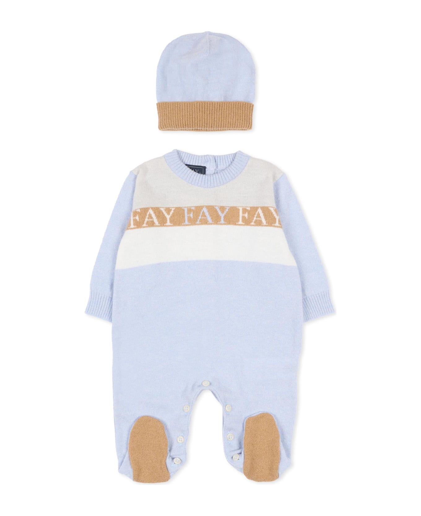 Light blue set composed of a jumpsuit and hat. Jumpsuit in wool and cashmere blend with long sleeves, crew neck and ribbed cuffs, button closure at the back and between the legs and feet; embellished with stripes and logo on the front. Light blue hat with brown turn-up.
