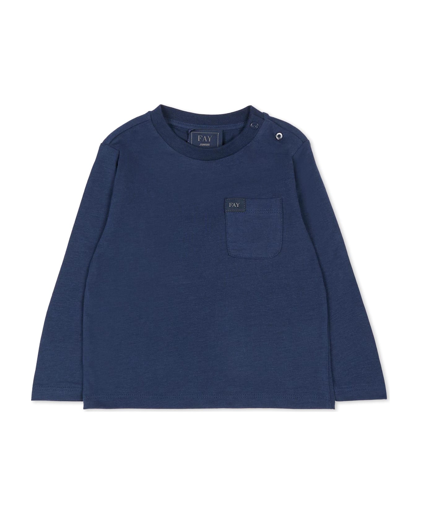 Blue cotton T-shirt with long sleeves, a crew neck, snap button closure on the shoulder, and a chest pocket. It is decorated with a logo patch on the front.