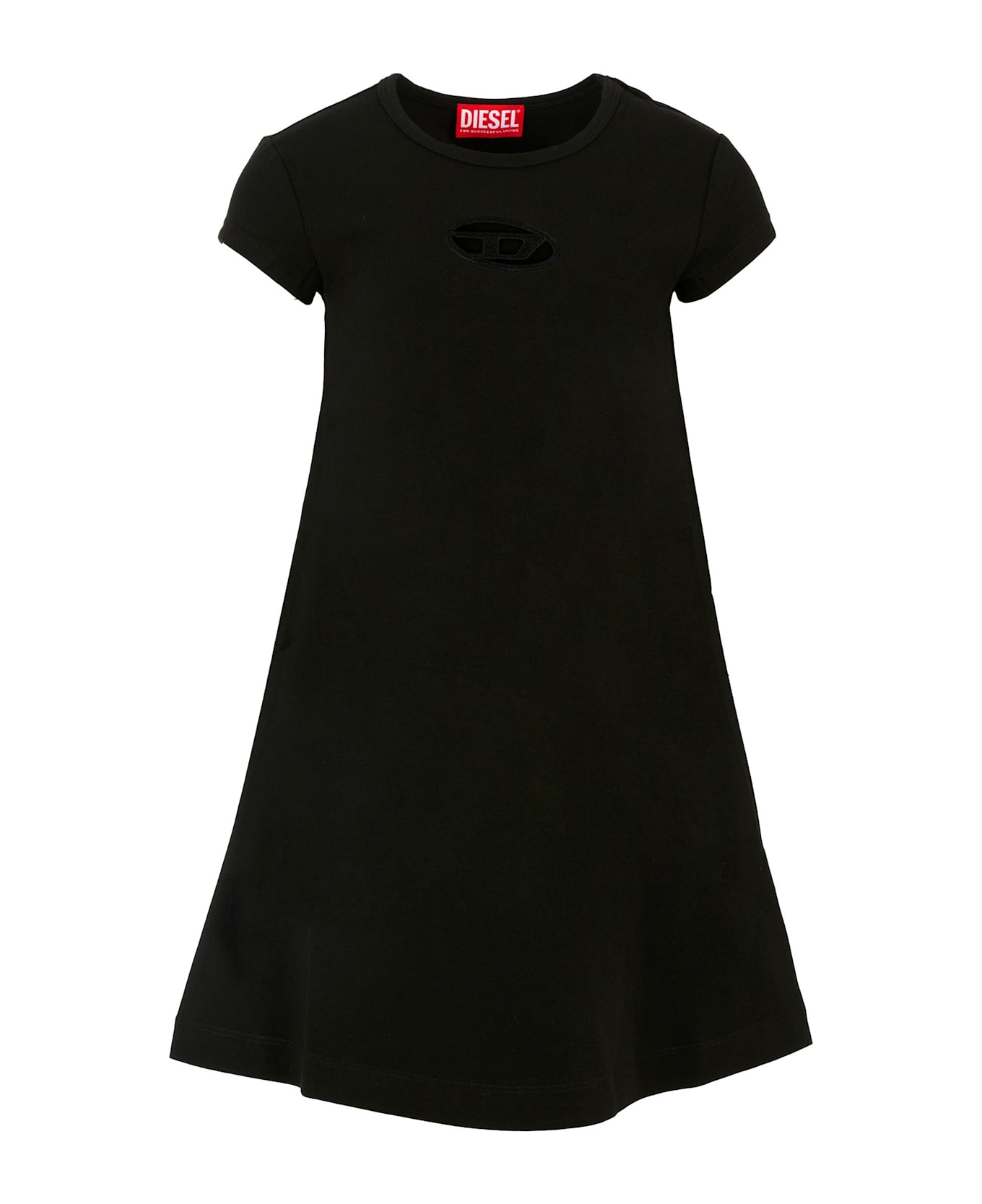 Black dress with short sleeves, a ribbed crew neck, and a cut-out detail on the front. It is embellished with embroidered logo on the front.