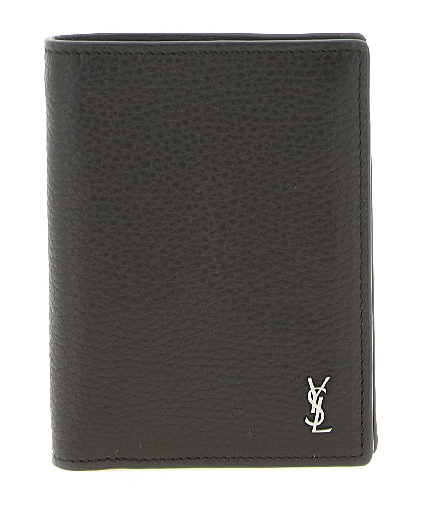 Hammered leather card holder, front metal 'Tiny Cassandre' logo, book opening. Composition: 100% calfskin leather (Bos Taurus)