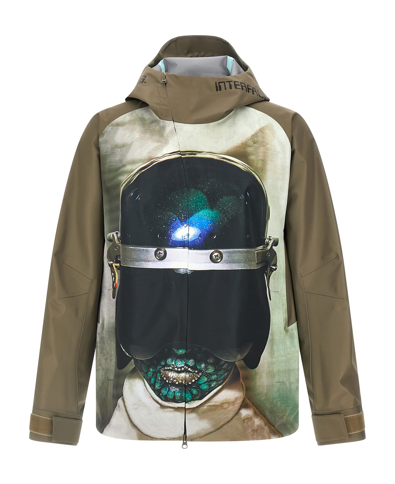 'UC2E4205-1' water-repellent nylon jacket, unlined, inner details with adhesive tape, front print with artwork from the band French HELDON, adjustable hood, high neck, front zip closure, pockets, long sleeves with adjustable cuffs, drawstring at the hem.