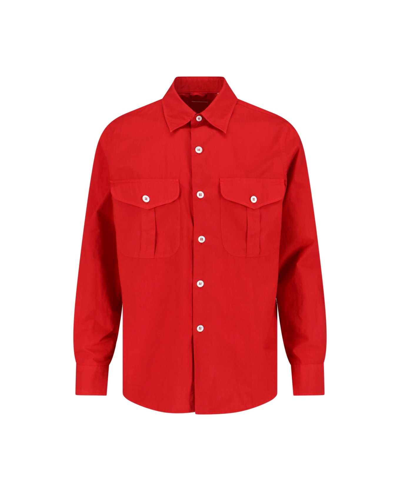 Aspesi red cotton button shirt with classic collar, button closure, long sleeves, two front button flap pockets, curved hem.
