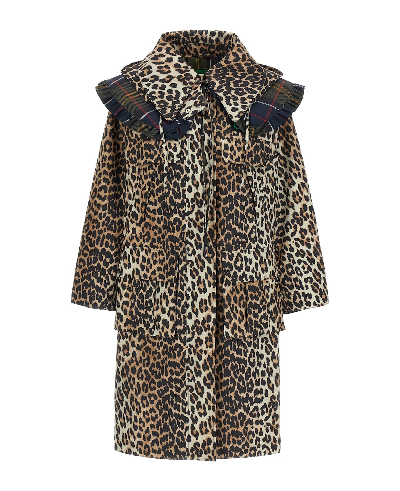 Barbour x GANNI parka in animal print waxed cotton, wide pointed collar, removable hood and collar with detachable ruffles check print, back pincer, front logo patch, zip closure, long sleeves with check print patches and cuffs. SUSTAINABLE: This product is made of organic cotton.