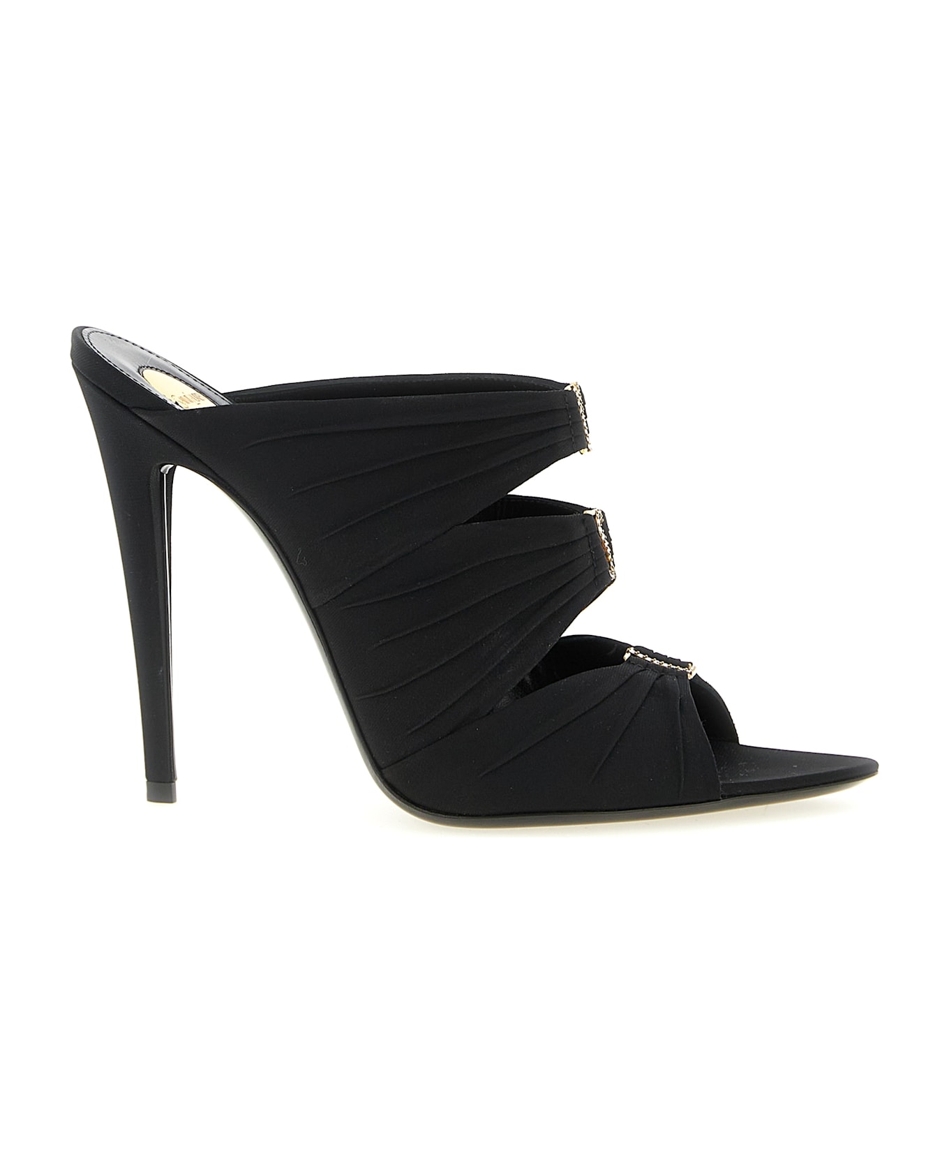'Emilie' crepe satin mules, curled upper with metal logo with rhinestones, peep-toe almond toe, stiletto heel, leather sole. Composition: 84% viscose, 16% acrylic