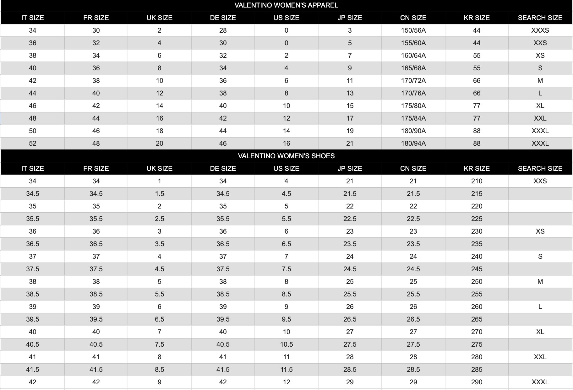 - Valentino (like most made in Italy footwear brands) uses Italian sizing. The shoes are available in women’s IT 34 to 42, and men’s IT 38 to 48.