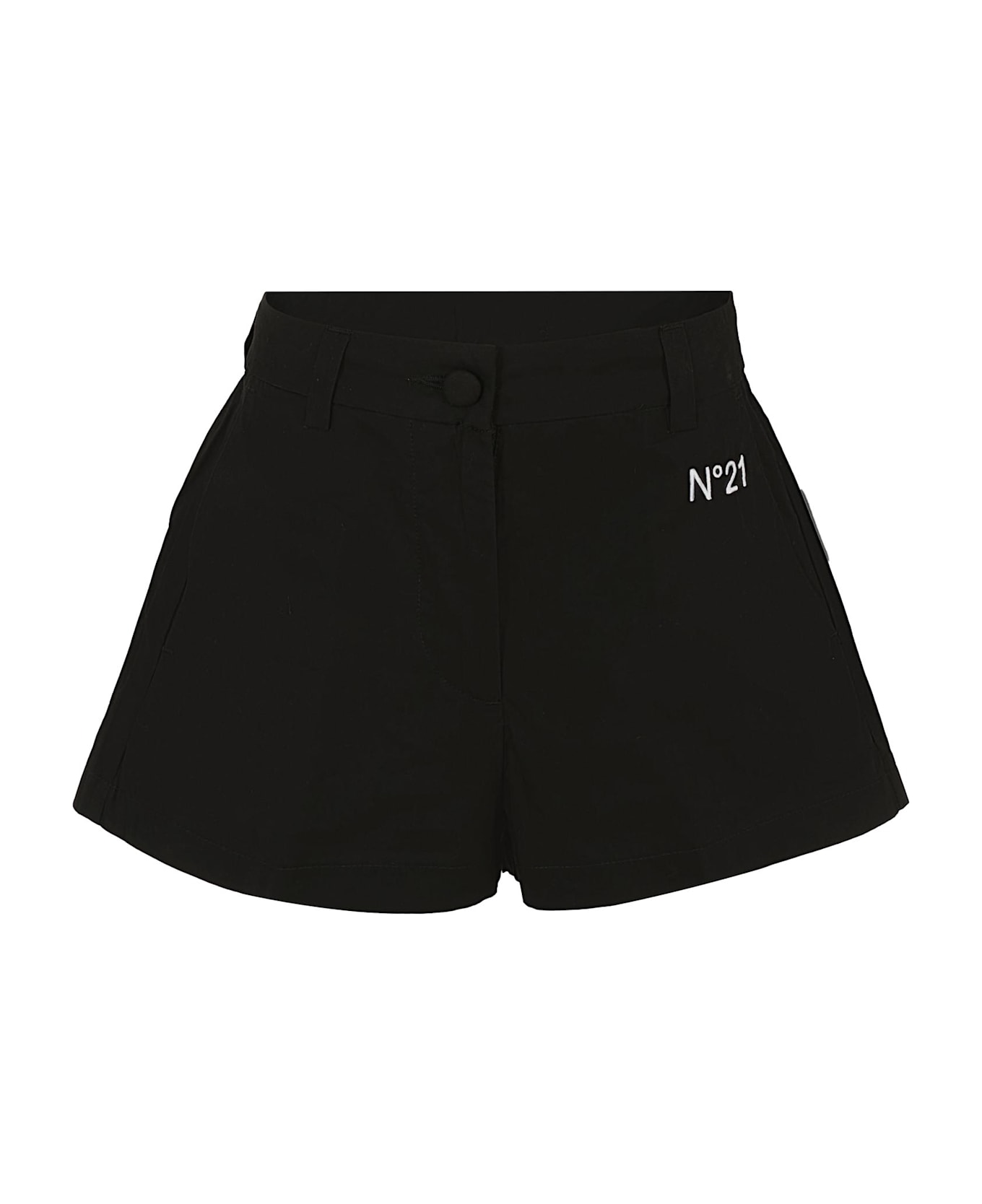 Black shorts with belt loops, a front zip and button closure, side pockets, and a back pocket; an adjustable waistband with internal buttons. They are embellished with a white logo embroidered on the front.