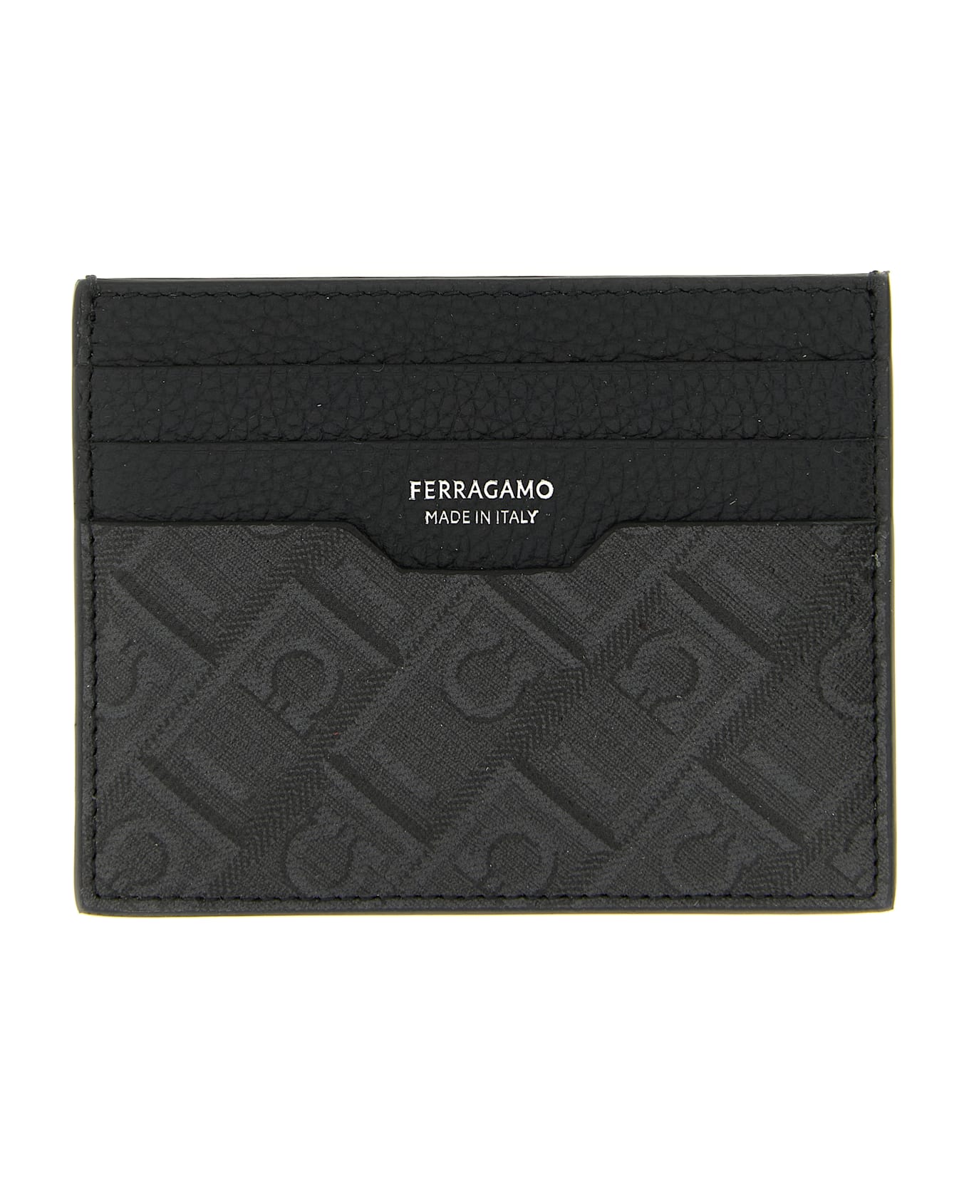 Hammered calf leather card holder with outer panels in coated fabric with tone-on-tone 'Ferragamo Monogram' print, and embossed logo on the front. Composition: 70% fabric 30% calf leather