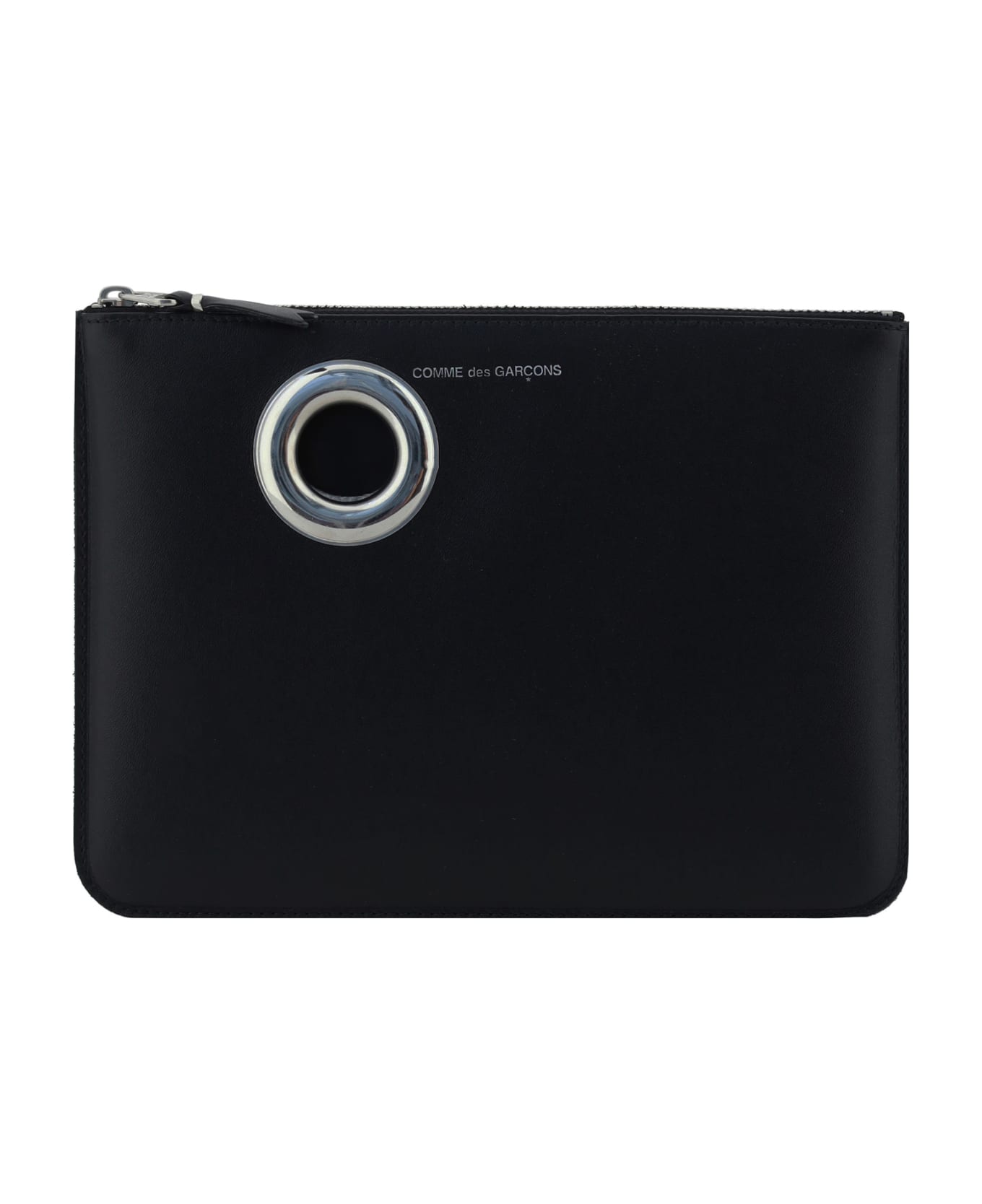 Leather silver eyelet coin purse by comme des garçons wallet, metal eyelet decoration,top zipper closure, single interior compartment.