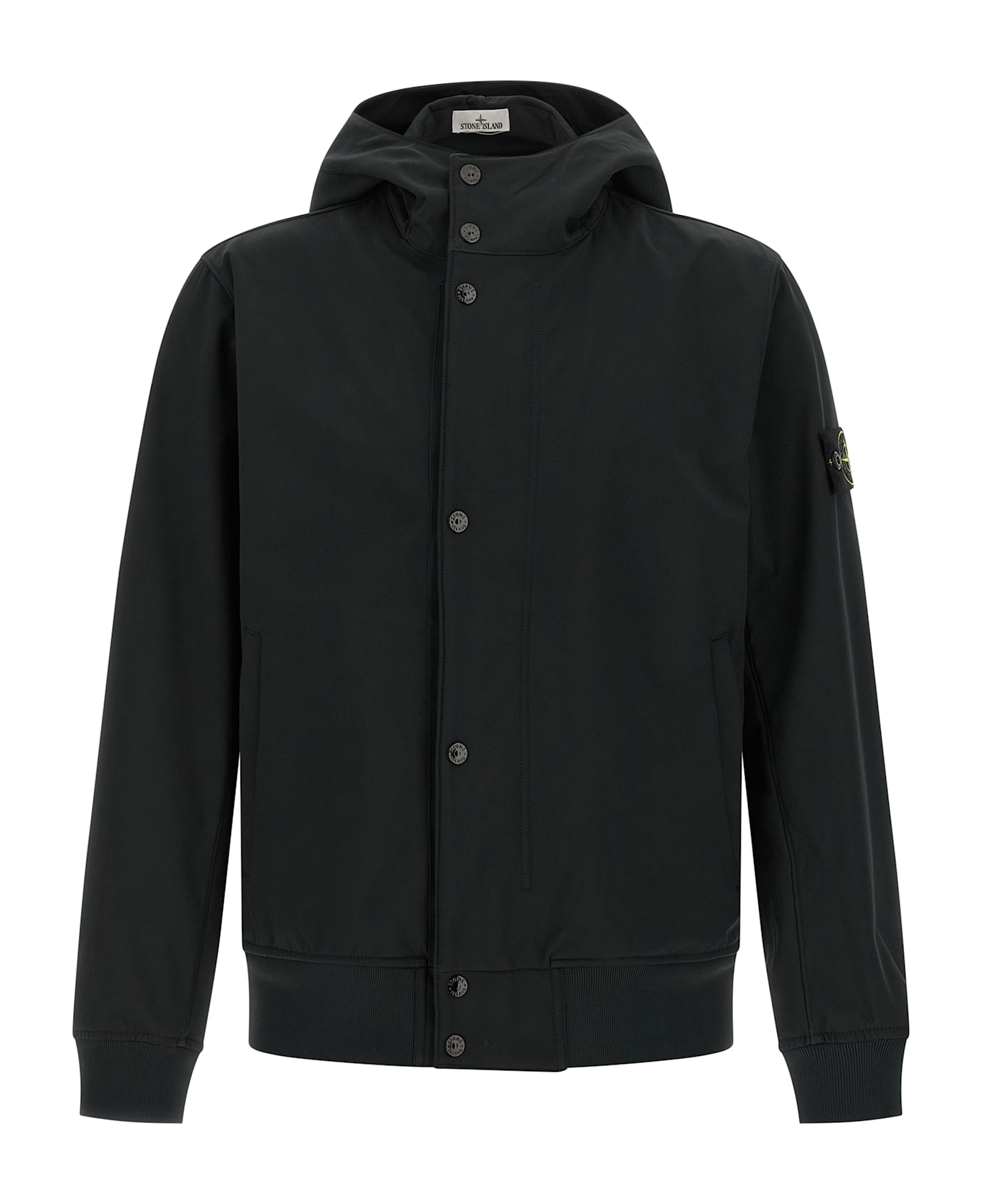 '4100118' jacket in three-layer technical material with 8000 mm water column with outer part in stretch polyester canvas woven with e. dye® Waterless Color System technology yarns and textured polyester jersey inner part with breathable and water and wind resistant membrane, adjustable hood, high neck, zip closure and front snap buttons, pockets, long sleeves with cuffs, logo badge appliqué, band on the hem.