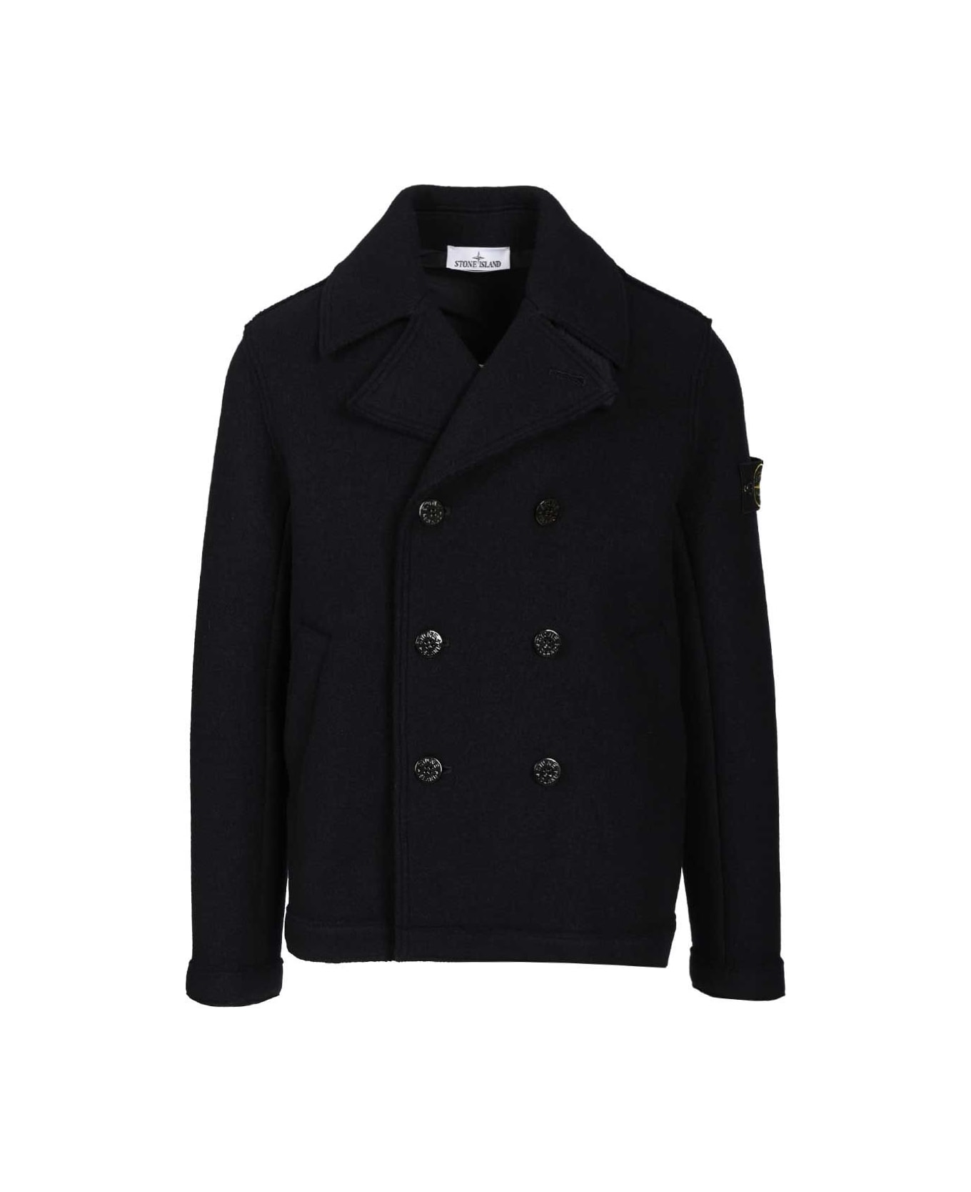 Double-breasted pea coat in RWS wool felt. Nylon twill undercollar. Buttoned chin strap. Slant pockets. Button closure. Oversized fit. Composition: 100% wool