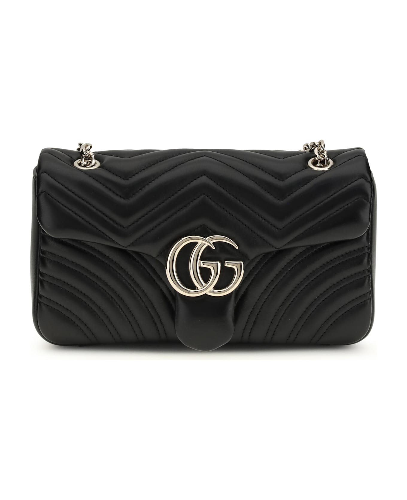The gg marmont medium shoulder bag by gucci is a classic reinterpreted with contemporary elegance. made of black matelassé lambskin leather in a chevron pattern, it is enhanced by light gold hardware details and gucci red ancora viscose lining. the spring-loaded flap protects items, while the interior features a zippered pocket and the exterior an open pocket. the sliding chain strap allows it to be carried comfortably over the shoulder.