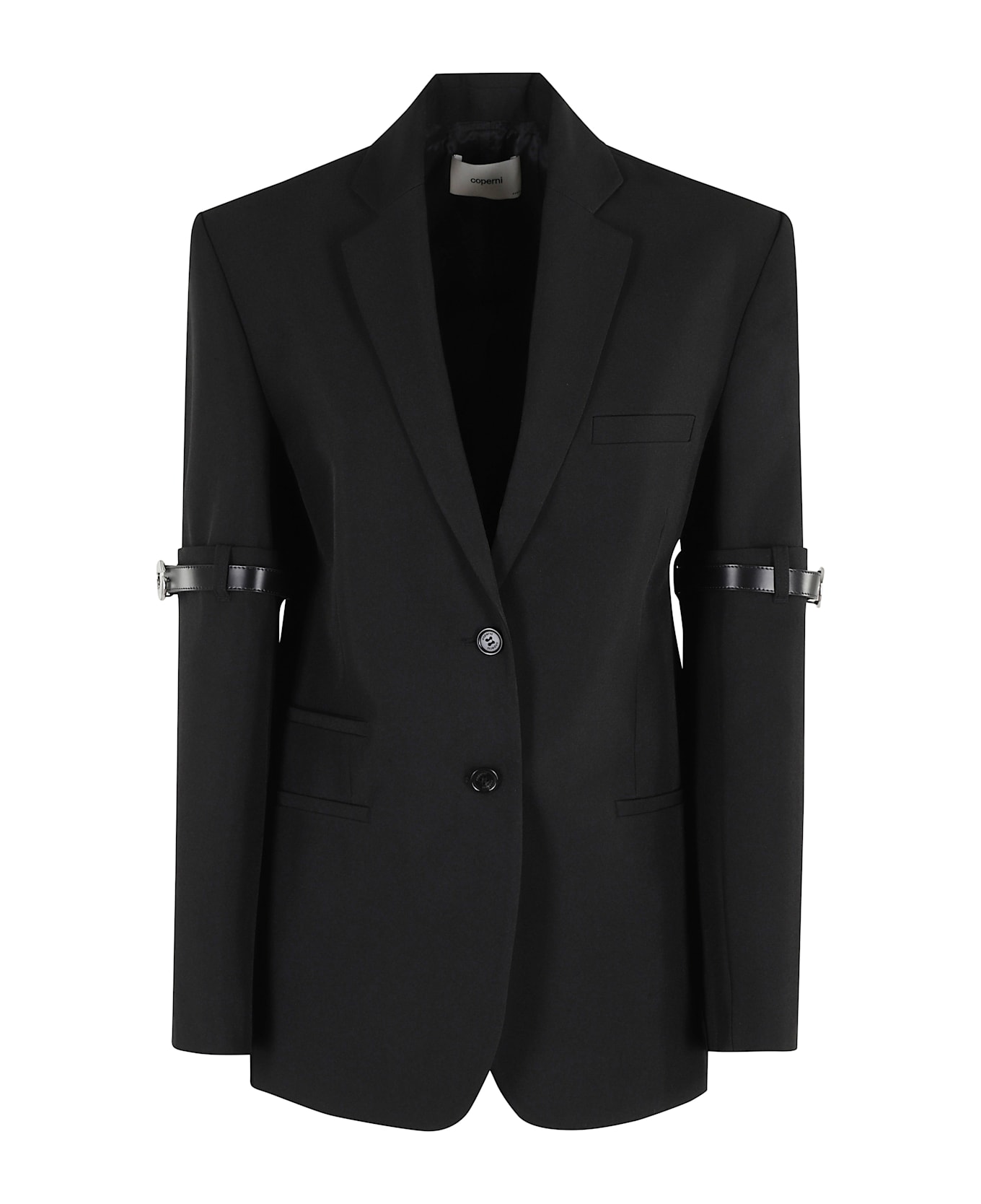 Belted Logo Blazer - Blanket - Black color - Peaked lapel neckline - Long sleeve with leather strap - Flush side pockets - Single breasted two button closure