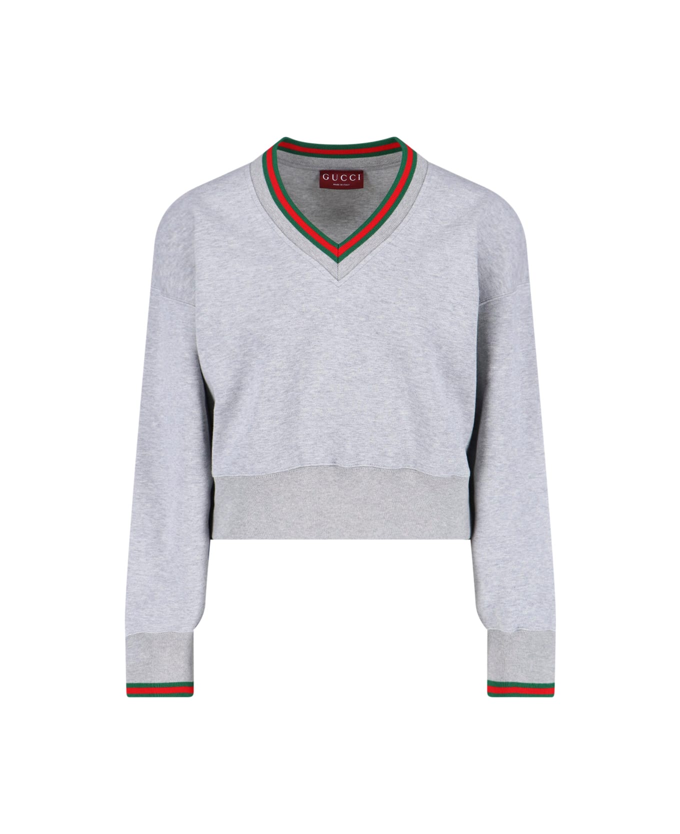 Gucci "web" sweater, V-neck, long sleeves, ribbed trim and two-tone "web" ribbon, straight hem. Composition: 100% Cotton