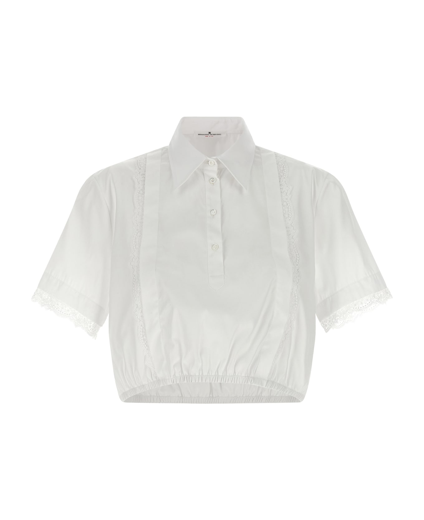 Cotton poplin shirt with tone-on-tone lace inserts, crop model, collar and buttons, short hands with cuffs, elastic on the hem. Composition: 100% cotton