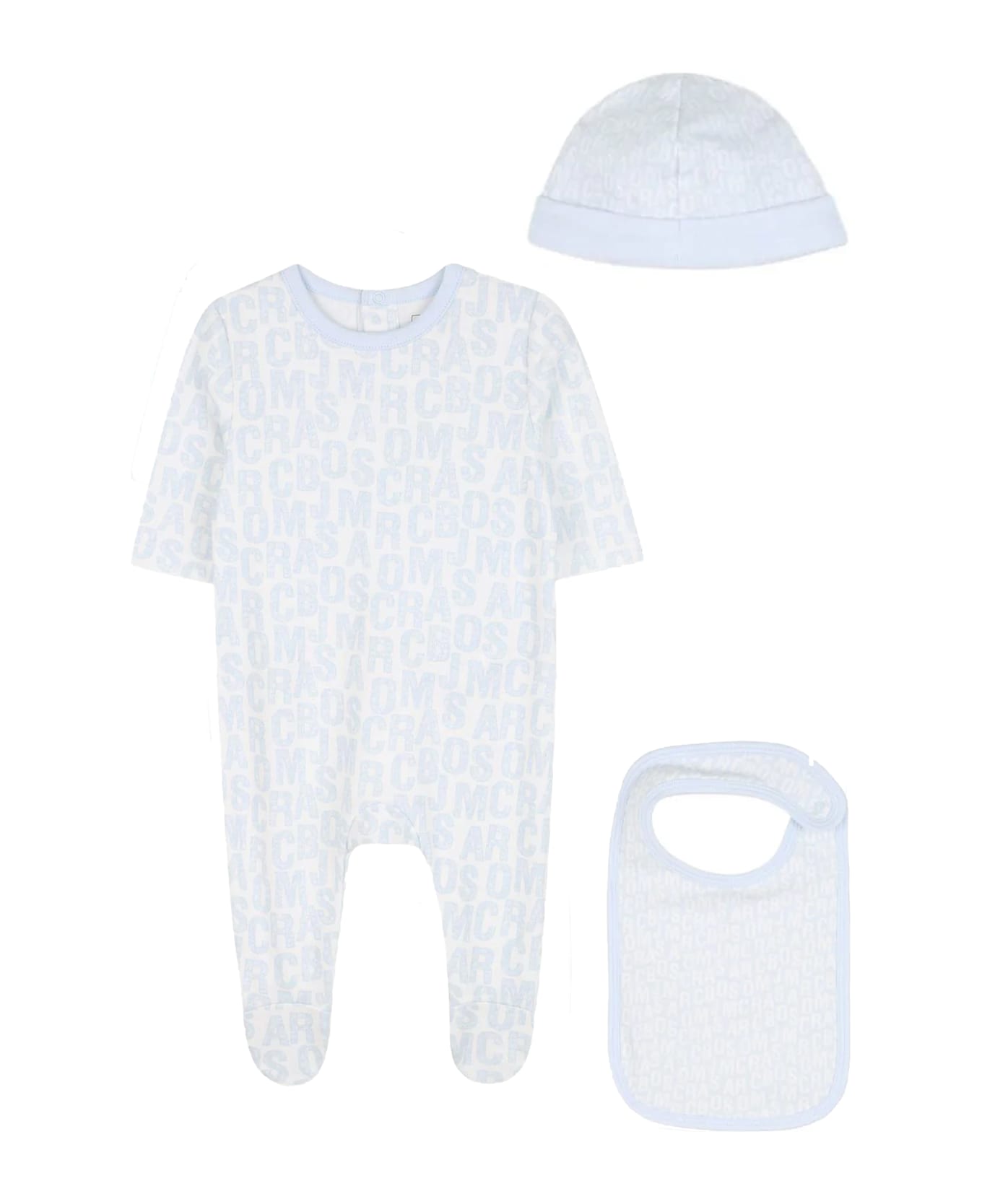 Light blue cotton babygrow set, composed of babygrow, bib, and hat. White babygrow in slightly heavy cotton, long sleeves, a light blue crew neck, feet, and snaps on the back; it is embellished with an all-over logo print. Bib with snap button on the side; hat with cuff.