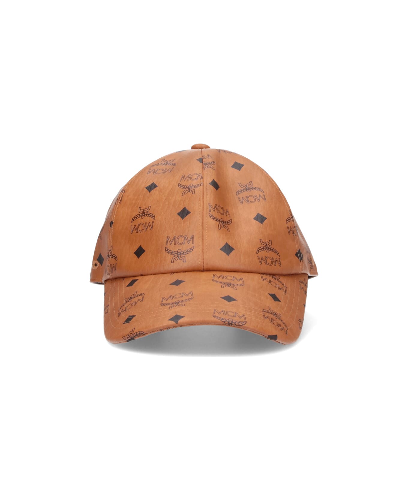 MCM logo baseball cap in brown "Visetos" with logo print pattern, curved visor, adjustable strap at the back.