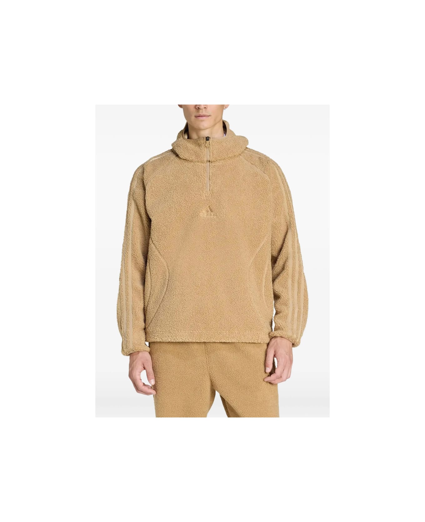 beige sleeve three-stripe detail hooded neck quarter-zip fastening