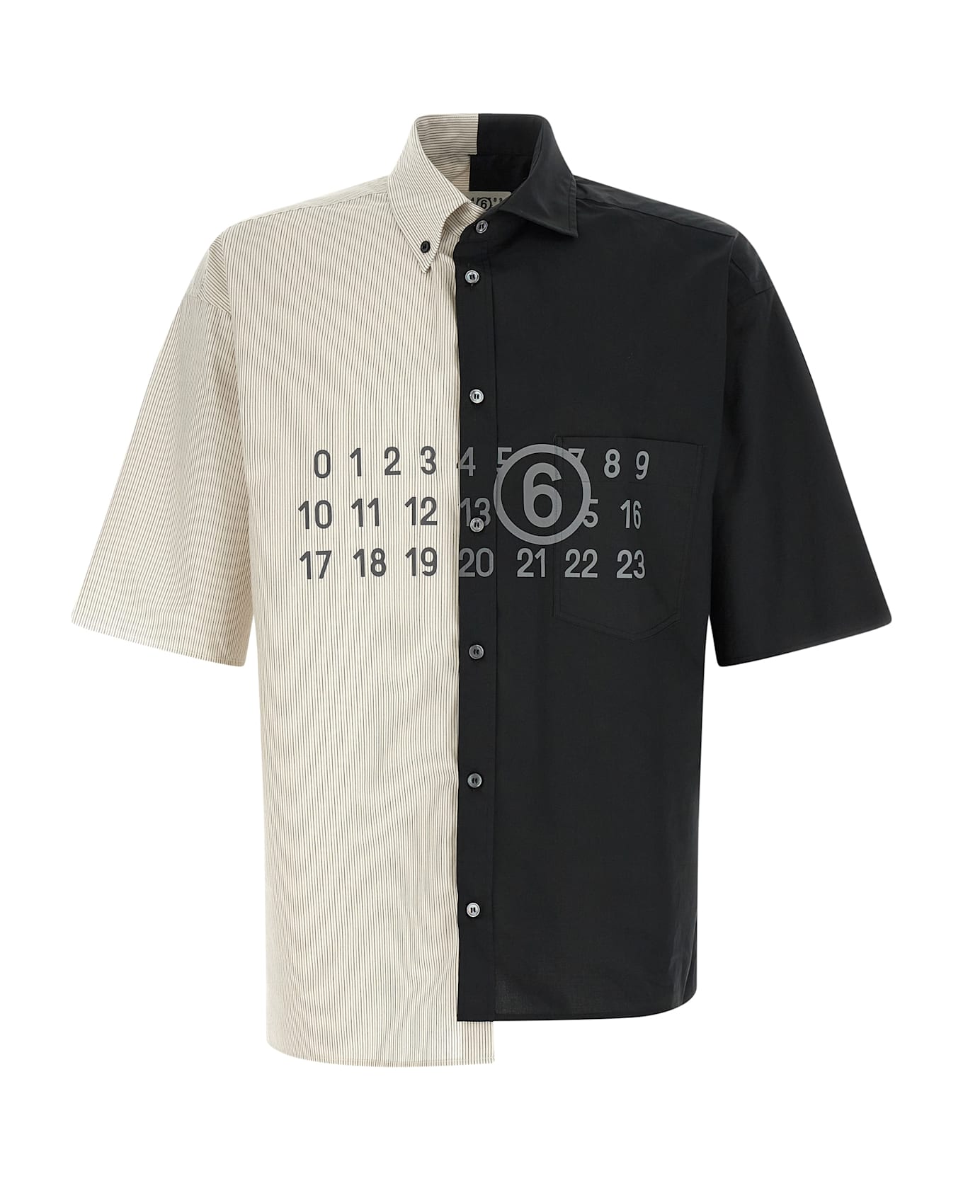 Cotton poplin shirt, patchwork construction consisting of solid color left and right side striped button-down, 'Numeric Signature MM6' print and front button closure, breast pocket, short sleeves, back 'White Stitch Line', asymmetric hem, raw cut hem.