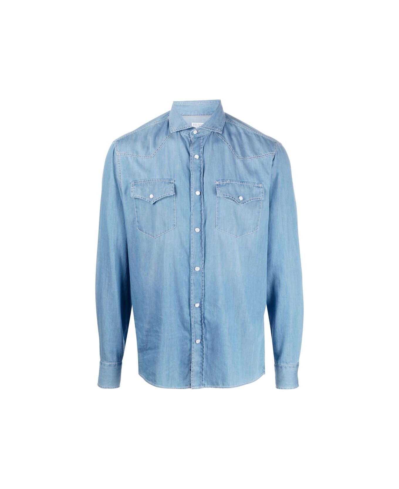 blue cotton light wash two chest flap pockets front button fastening classic collar long sleeves buttoned cuffs curved hem