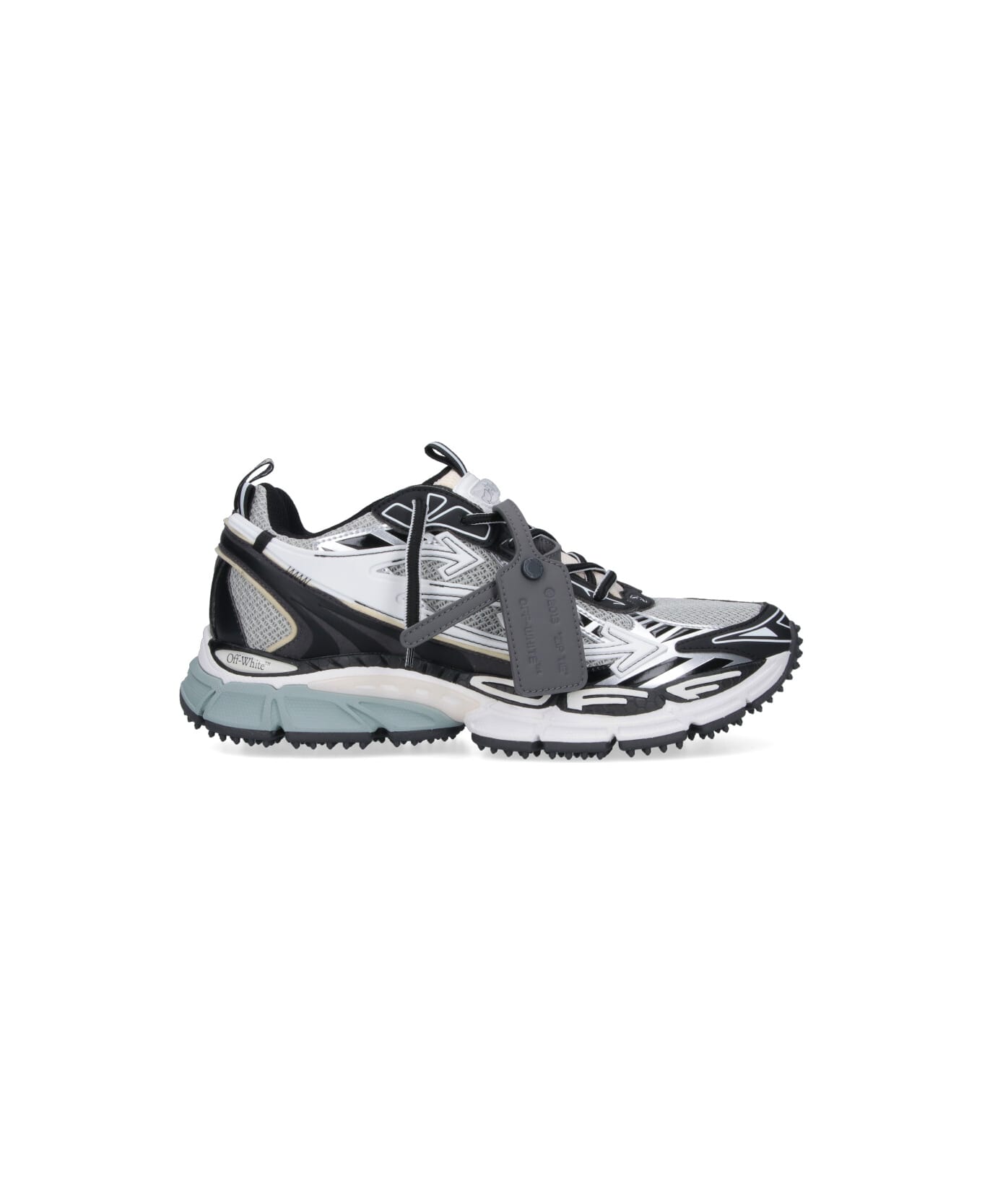 Off-white "Be Right Back" sneakers in gray fabric with round toe, lace-up closure, iconic logo tag on the side, logo on the front tab, contrast "Arrow" logo on the front, textured rubber sole.