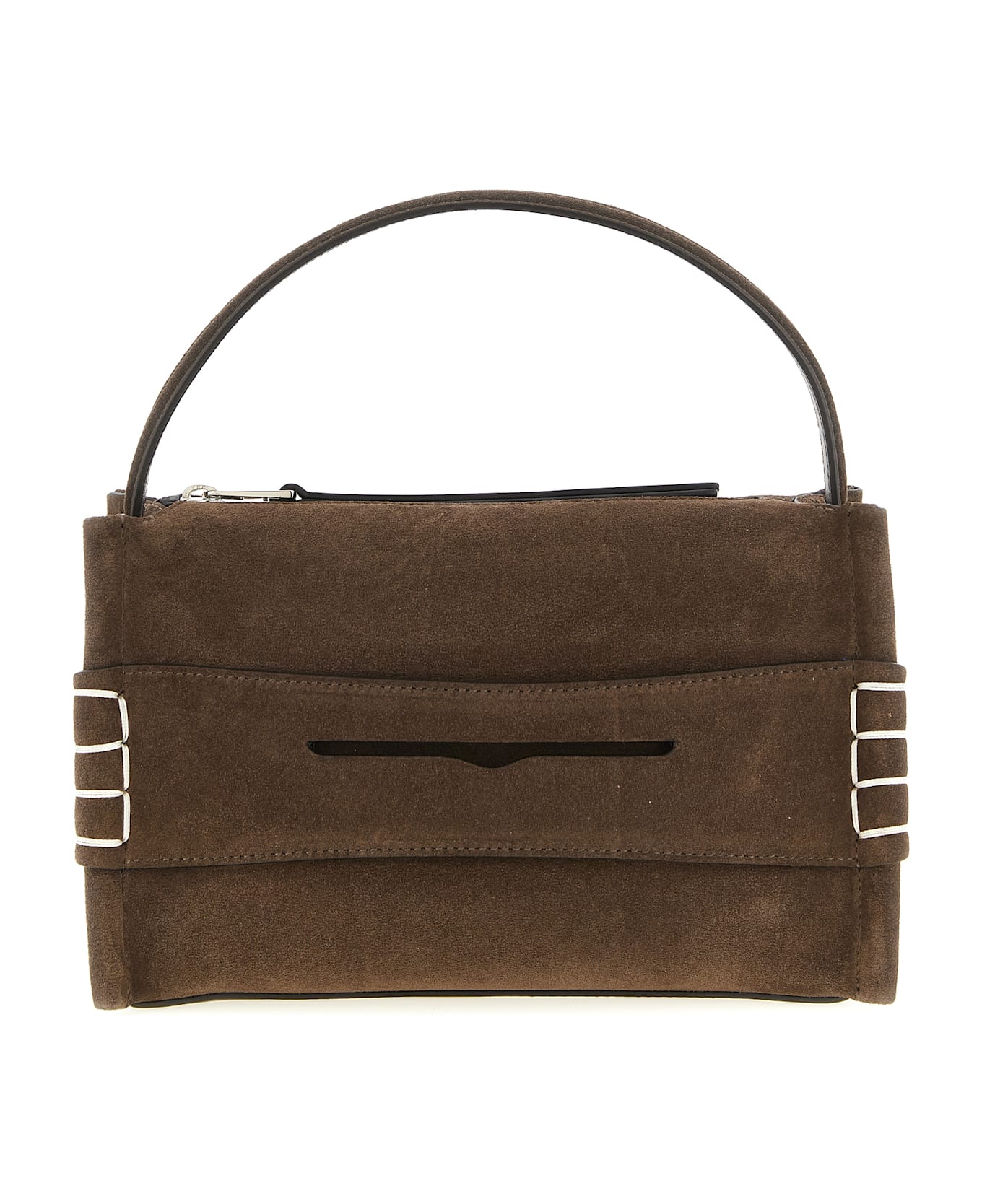 Small suede 'Loafer' handbag, hand-stitched front 'Penny Keeper' detail with box stitches, fixed handle, top zip closure, tone-on-tone smooth leather base mimicking the sole of a moccasin, back embossed logo, adjustable and removable shoulder strap.