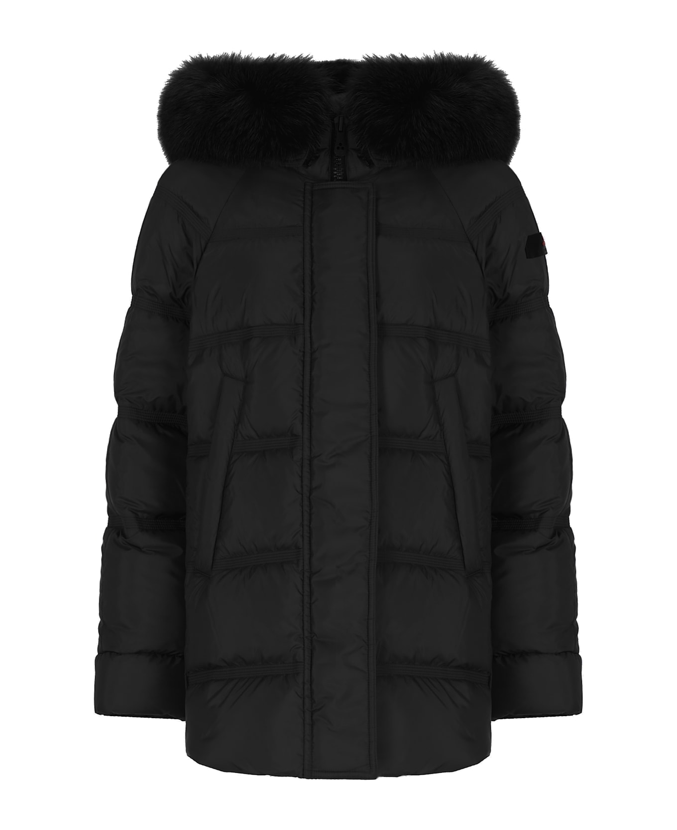 - Peuterey woman's black down jacket - Hood with fur - Long sleeves - Iconic logoed patch at left sleeve - Two side pockets with snap buttons - Front zip and snap buttons fastening - Side zip details
