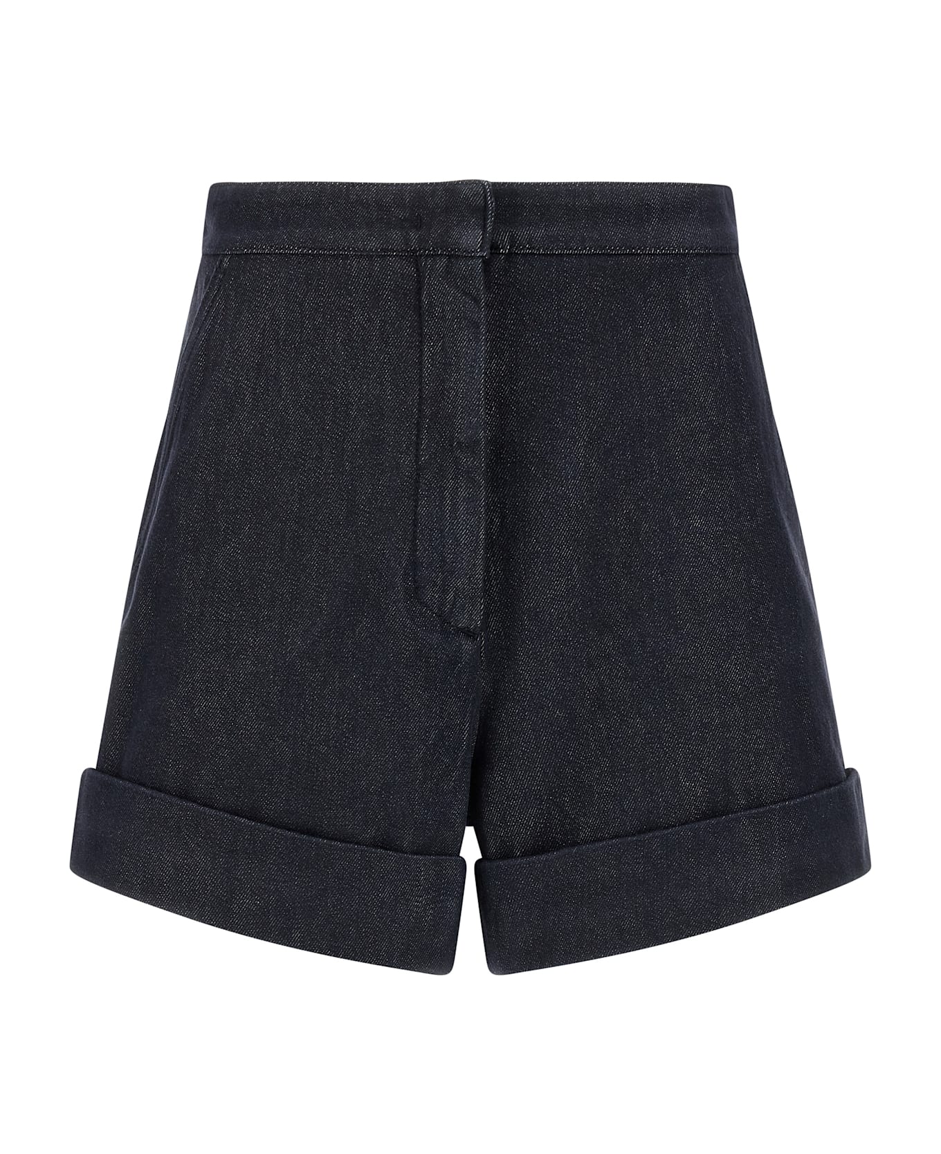 'Mxmcalca' shorts in pure cotton yarn-dyed denim effect fabric, high waist, zip hook and button closure on the front, pockets, back pincers, turn-up hem. Shorts with Max Mara logo embroidered in tone-on-tone thread at the waist on the back.