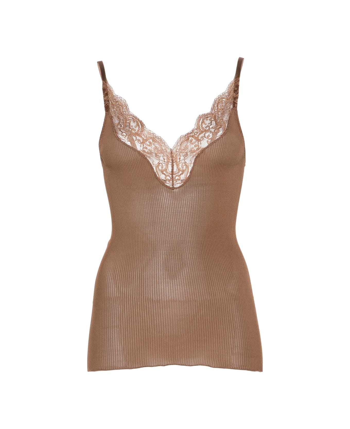 brown ribbed knit lace panel V-neck spaghetti straps adjustable straps