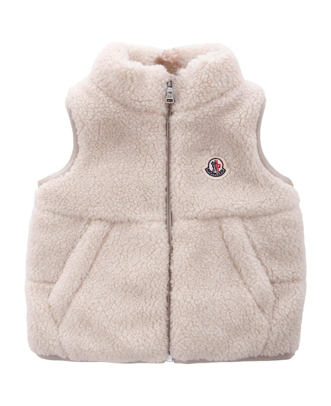 Beige gilet from the luxury brand Moncler Kids, in eco-shearling on the front, padded and quilted on the back, with a high collar, front zip fastening and side pockets with snap button. It is decorated with an iconic logo patch applied on the chest.