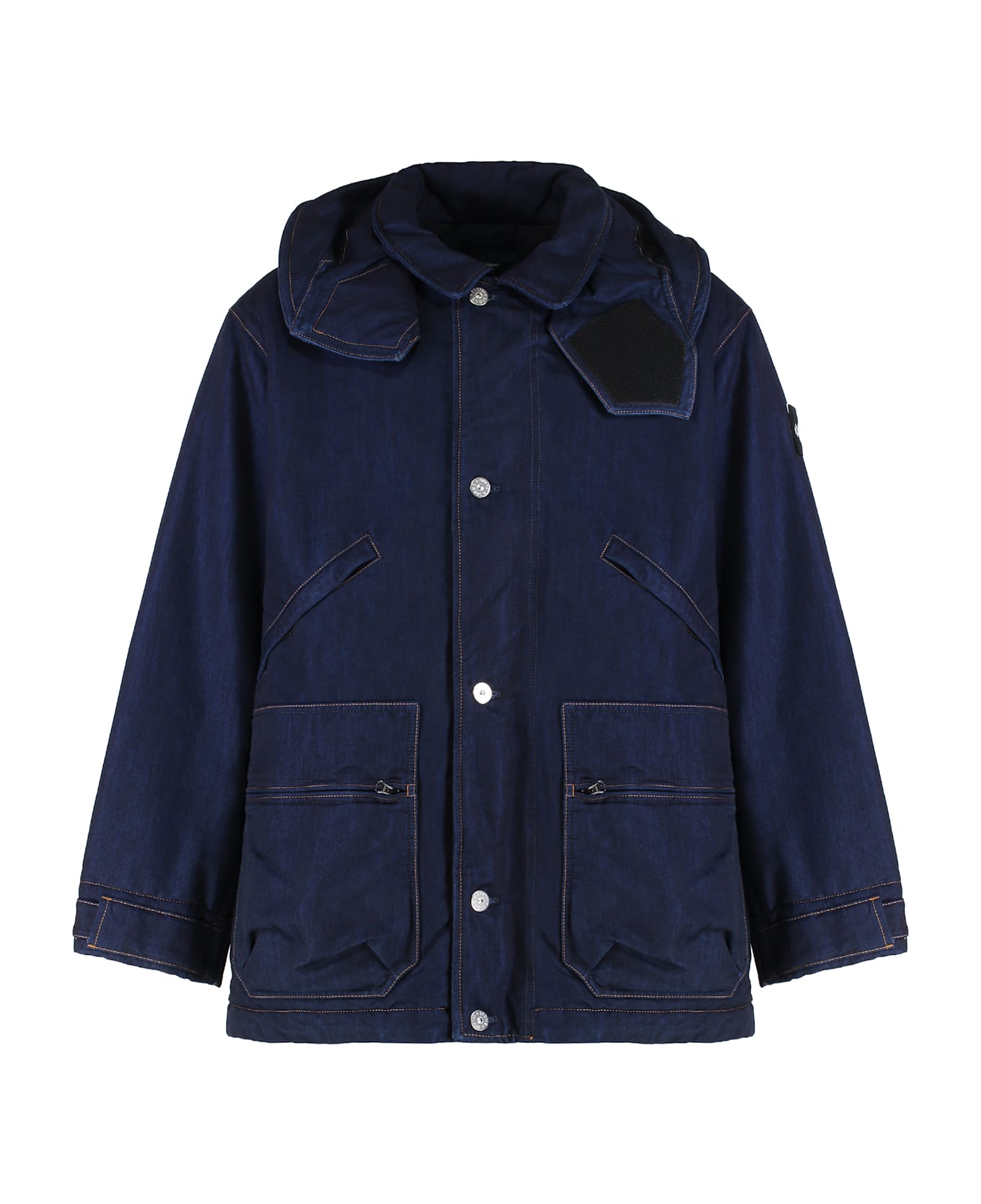 Short parka in lightweight denim fabric of 7 oz, made from indigo-dyed cotton and polypropylene yarns, featuring a removable hood, internal padding, and contrast stitching. rinsed finish.