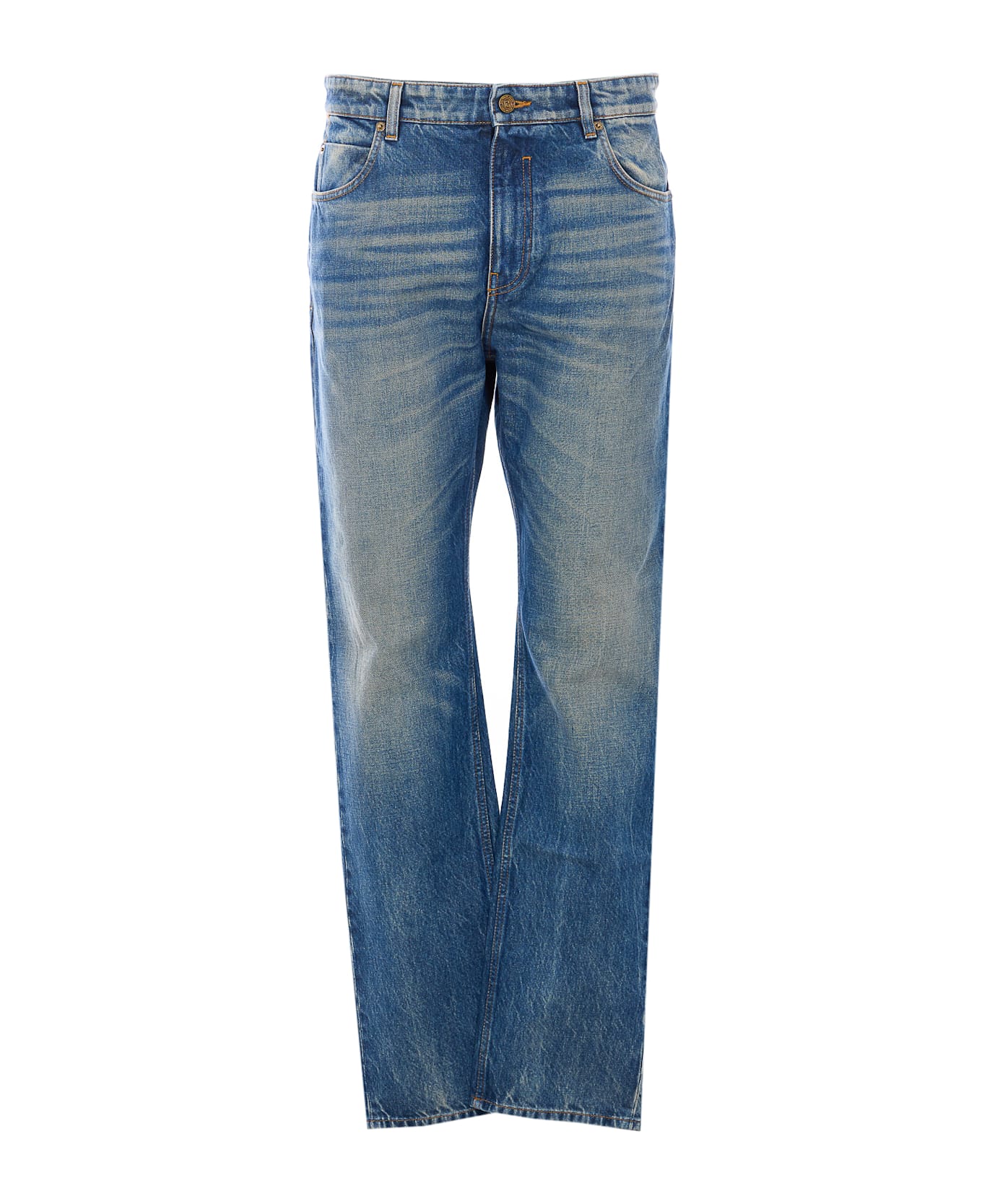 Balmain denim jeans, zip and button closure, embroidered detail on the backì, patch logo on the back, straight fit Composition: 100% Cotton, 65% Polyester, 35% Cotton
