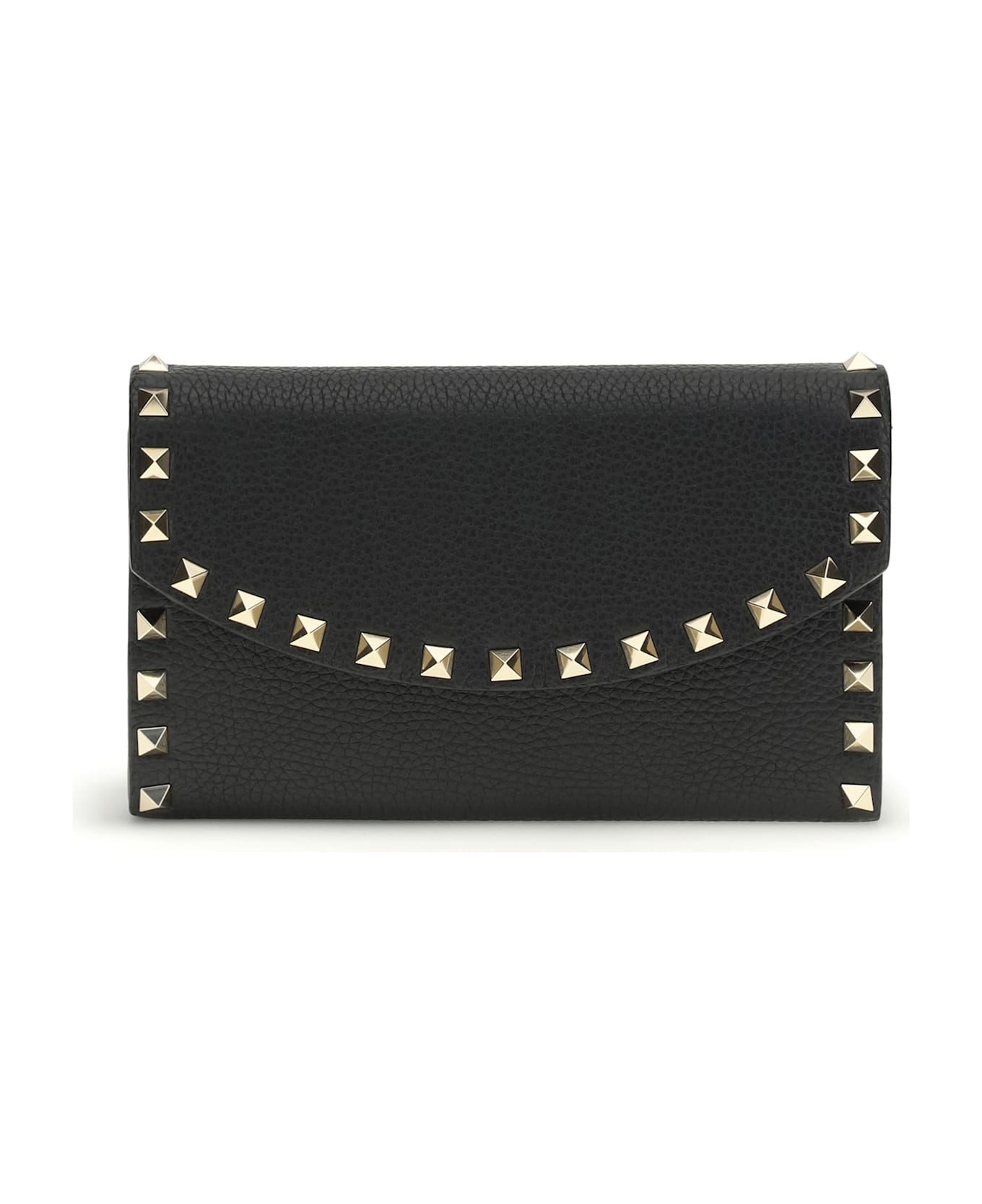 The rockstud chain wallet by valentino garavani is a refined and versatile accessory, crafted in garnet calfskin for a touch of elegance. rockstud studs and platinum-finish hardware add a distinctive and bold detail. thanks to the removable chain, it can be worn either by hand or over the shoulder/across the body, offering practicality and style. the interior is organized with an internal wall pocket and three card compartments, while the nappa lining adds a touch of luxury. the magnetic button closure ensures security and ease of use.