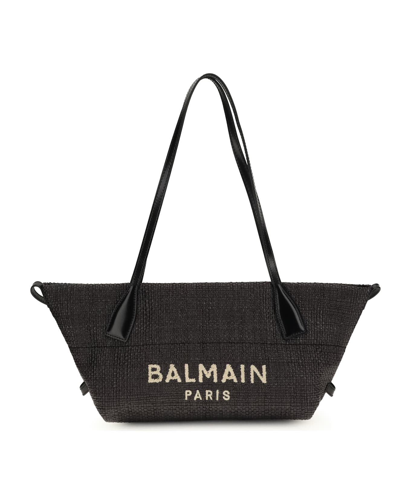 The calfskin and raffia track shoulder bag by balmain combines refined materials and versatile design, designed to be carried by hand, shoulder or cross-body depending on the occasion. the leather handles ensure comfort and solidity, while the balmain paris logo on the front adds a distinctive and refined touch. an elegant and contemporary accessory, ideal to complete any look with style.