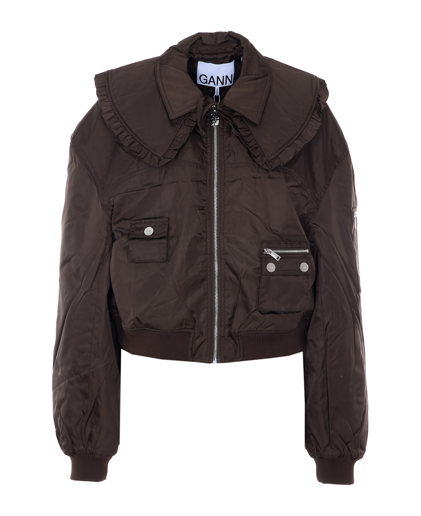 Ganni demitasse Duchesse nylon jacket with frontal zip closure, removable maxi collar, pockets, elasticized on waist, cuffs Composition: 93% Polyamide, 7% Polyurethane, 57% Acetate, 43% Vicose, 100% Polyester