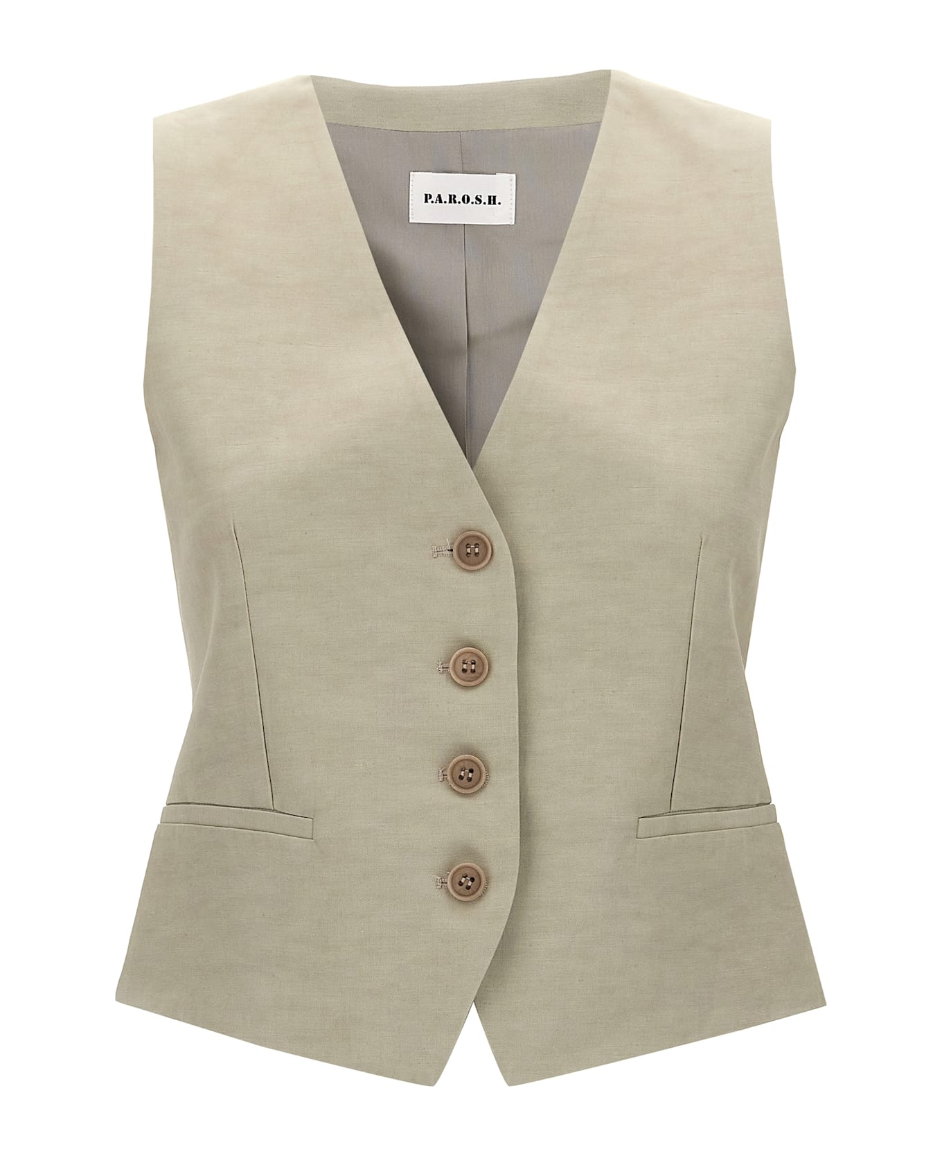 'Raisa' vest in viscose and linen blend with button closure, pockets, back strap. Composition: 72% viscose, 28% linen