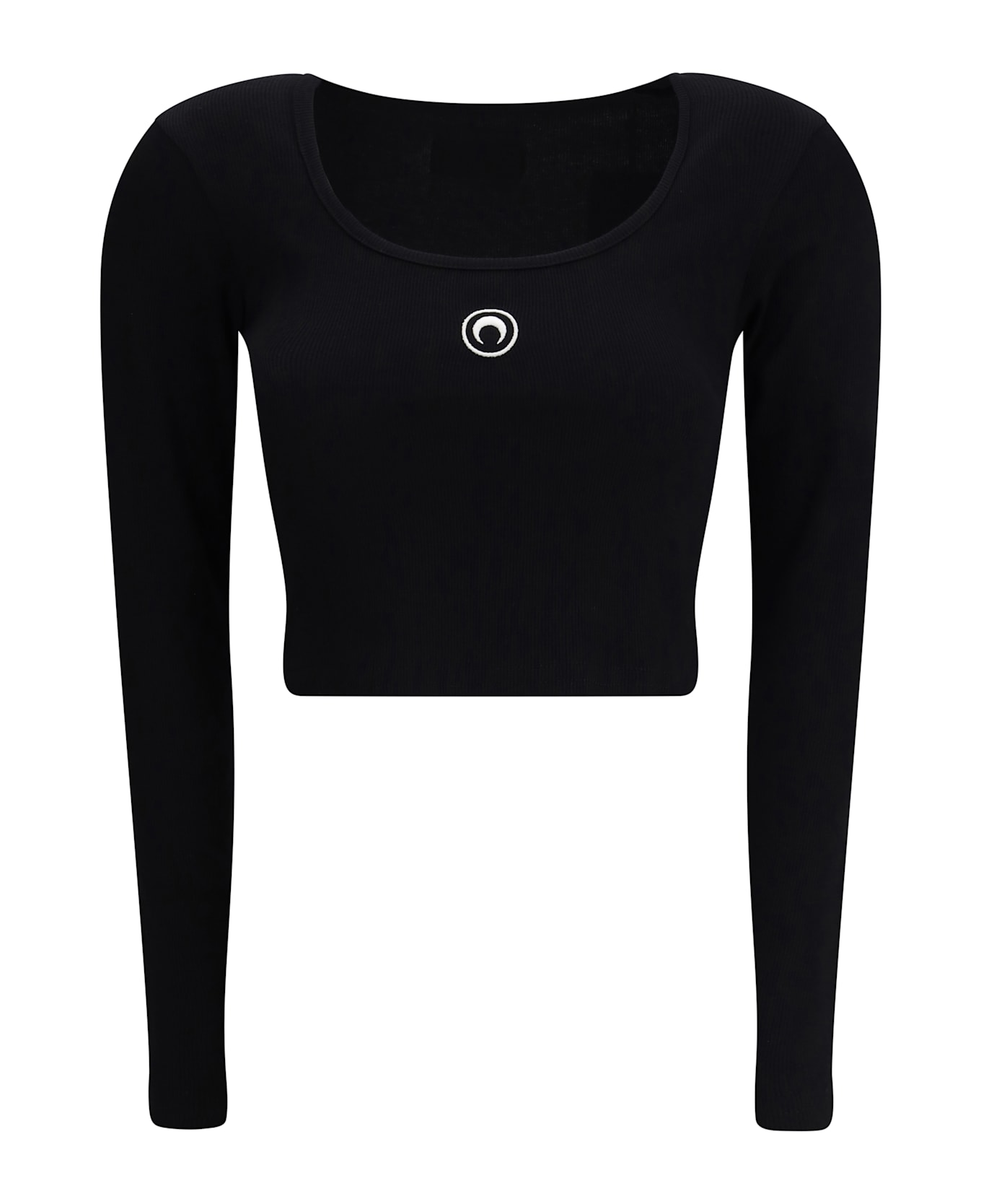 The moon logo long-sleeved top by marine serre redefines the classic t-shirt with a modern, sporty elegance. featuring a fitted cropped silhouette and a ribbed round neckline, it highlights the precision of its construction. the embroidered crescent moon logo and the woven branded label at the back add a signature touch, emblematic of the brand s contemporary aesthetic. an essential and refined piece, perfect for completing dynamic and urban looks.