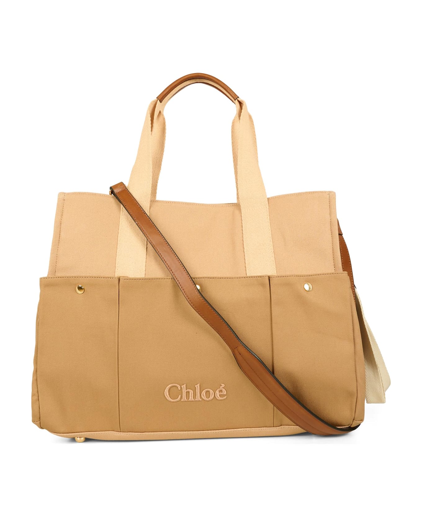 Beige changing bag with handles, a removable shoulder strap, three front pockets with snap closures, side pockets, a removable internal pouch, a portable changing mat, and stroller straps. It is embellished with an embroidered logo on the front.
