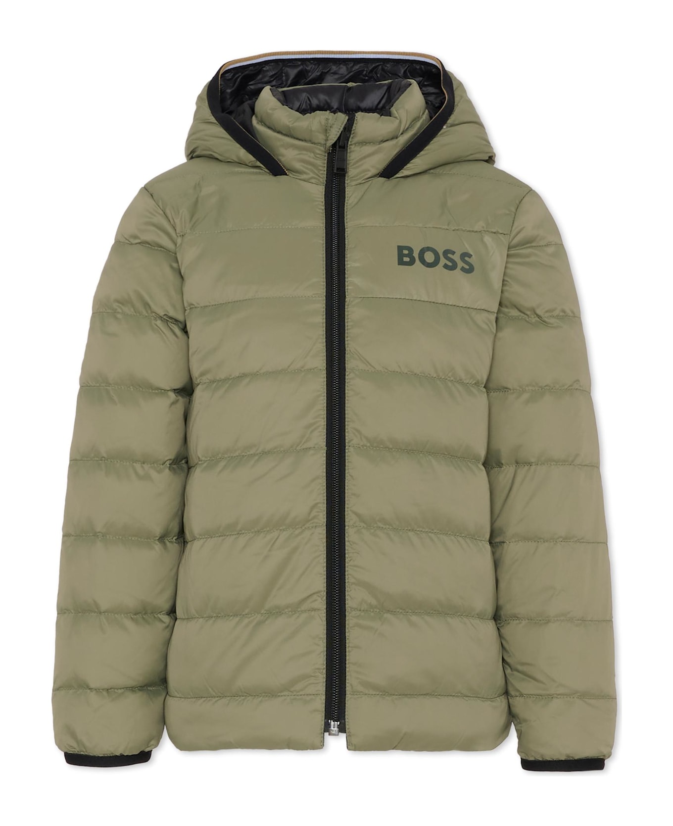 Reversible green and black lightweight down jacket, padded and quilted, with long sleeves, a hood, a front zip closure, and side pockets. It is embellished with a logo print on the chest.