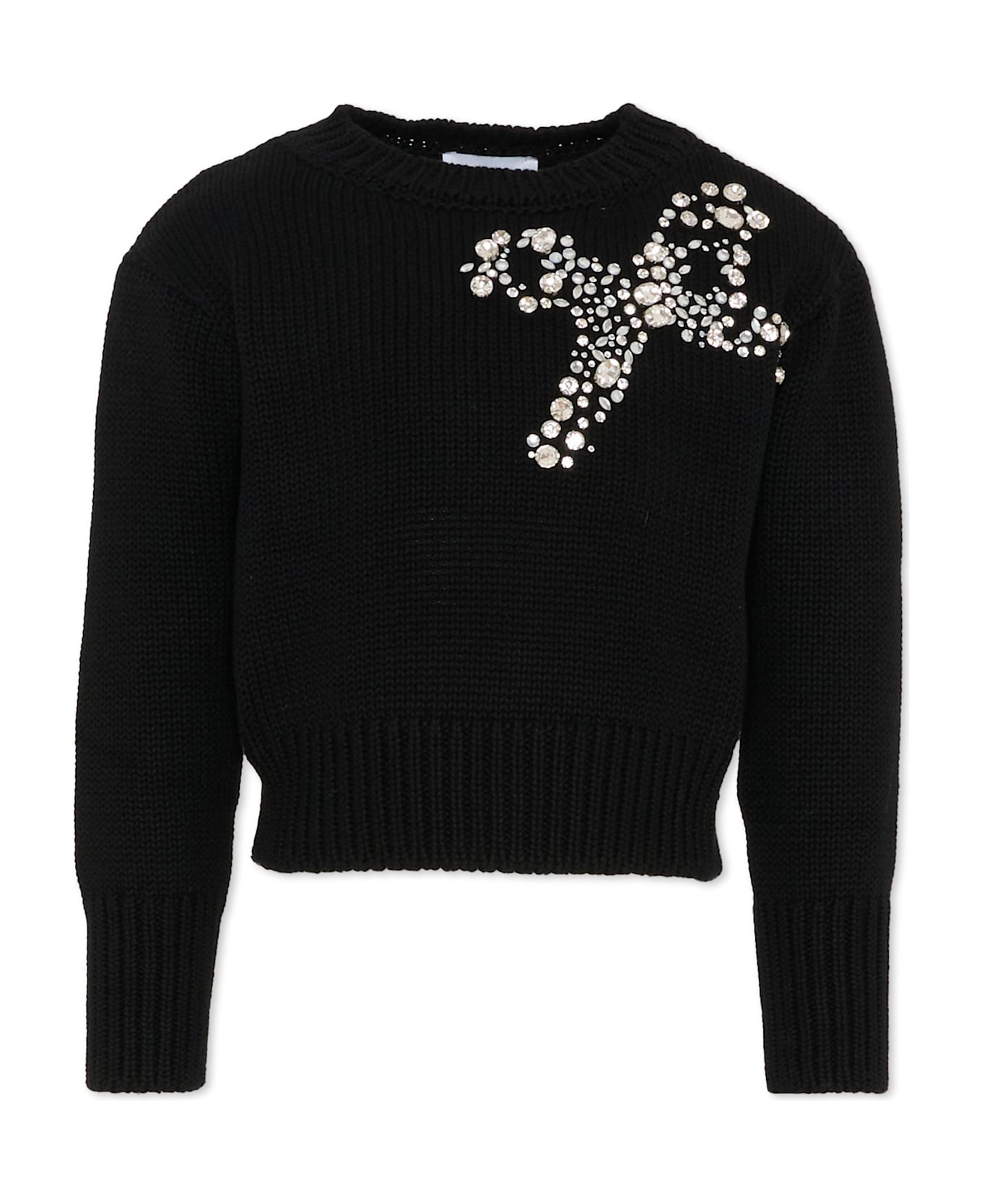 Black cotton crop sweater with long sleeves, a crew neck, ribbed cuffs, and hem. It is embellished with a rhinestone and stone bow on the front.