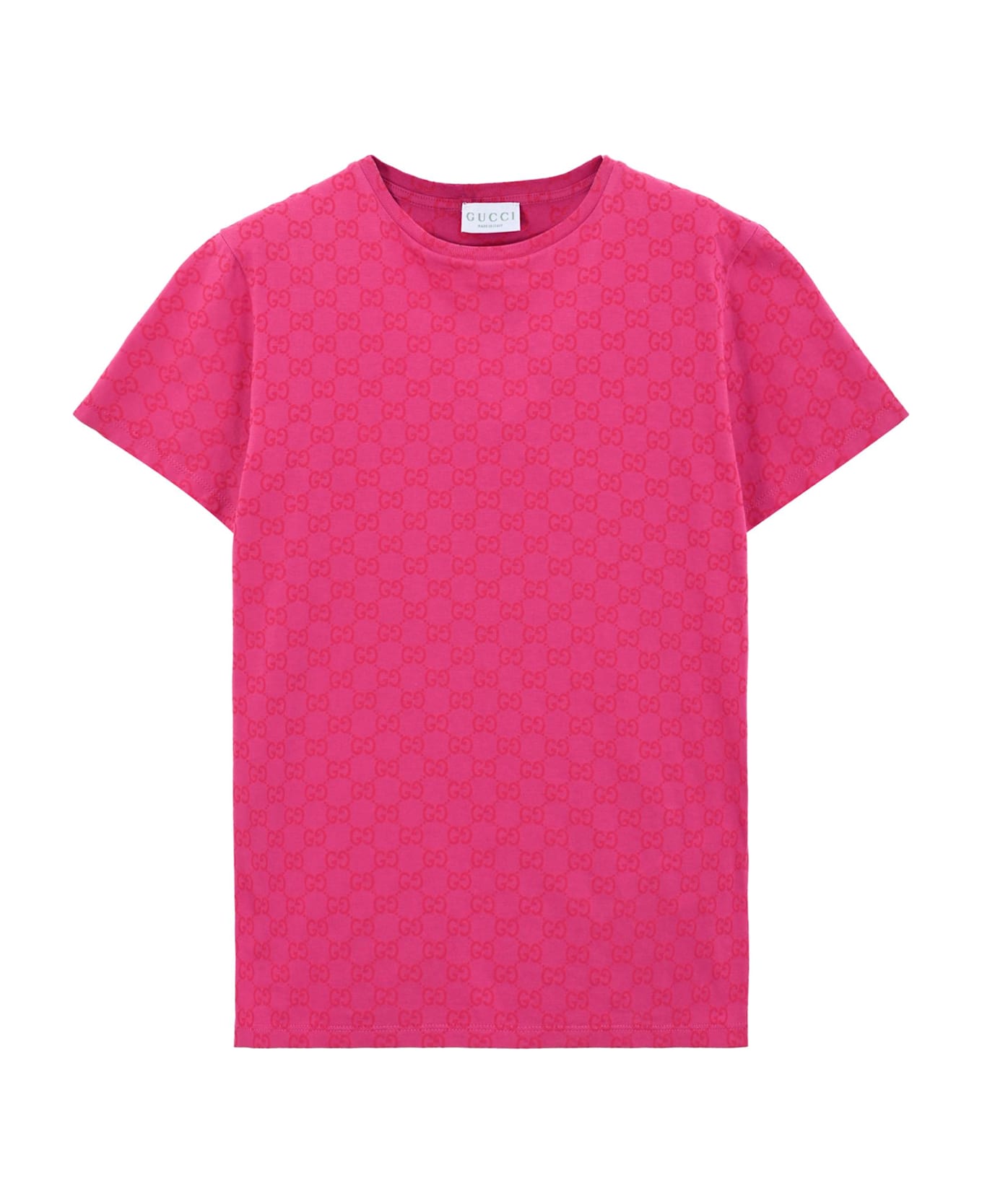Fuchsia t-shirt from the luxury brand Gucci Kids, made of soft cotton jersey, with short sleeves and a ribbed crew neck. It is embellished with an iconic all-over contrasting GG motif.