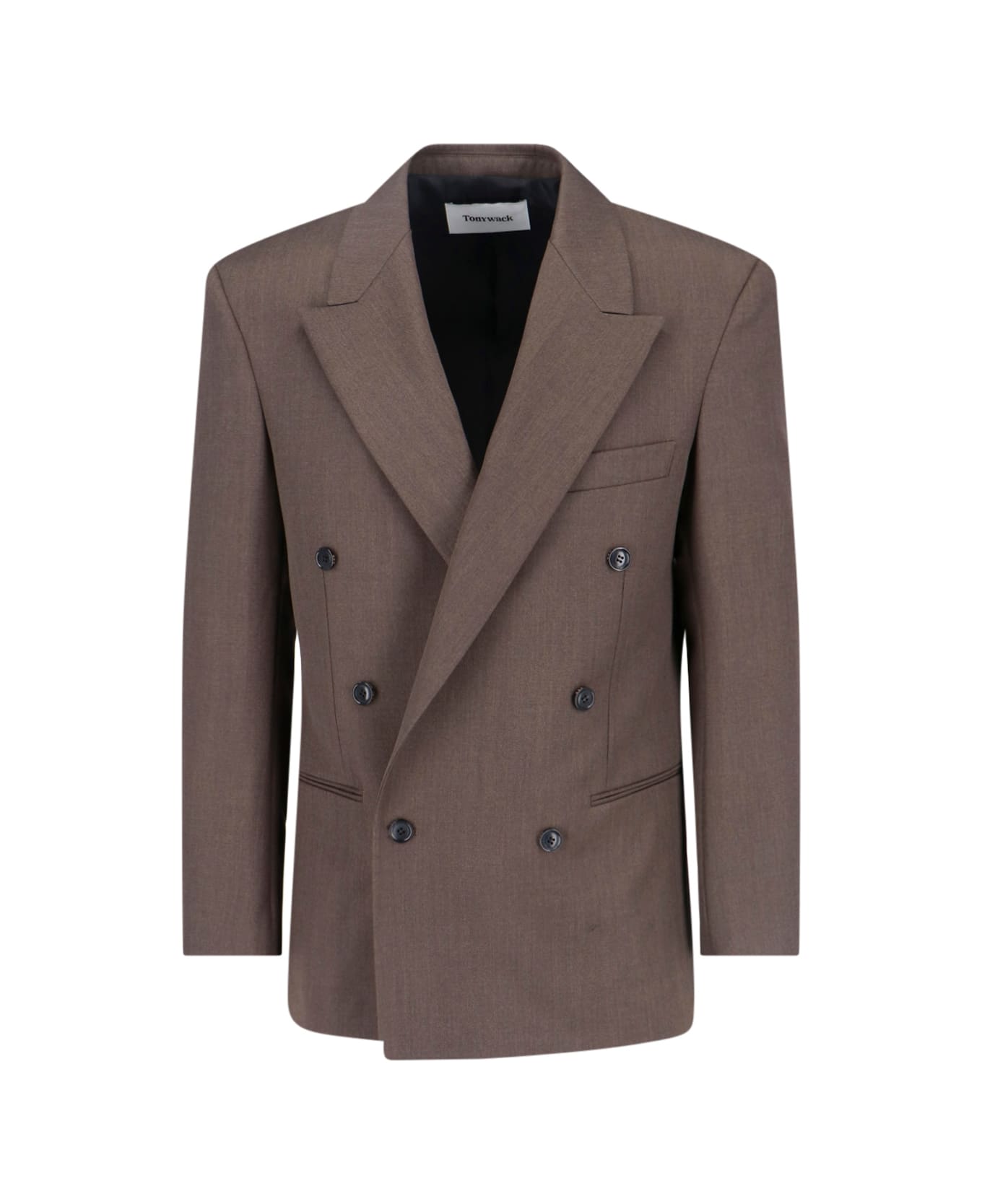Tony Wack double-breasted blazer in dark beige wool blend with peak lapels, button closure, chest pocket, two front welt pockets, straight hem. Composition: 50% Wool, 50% Polyester